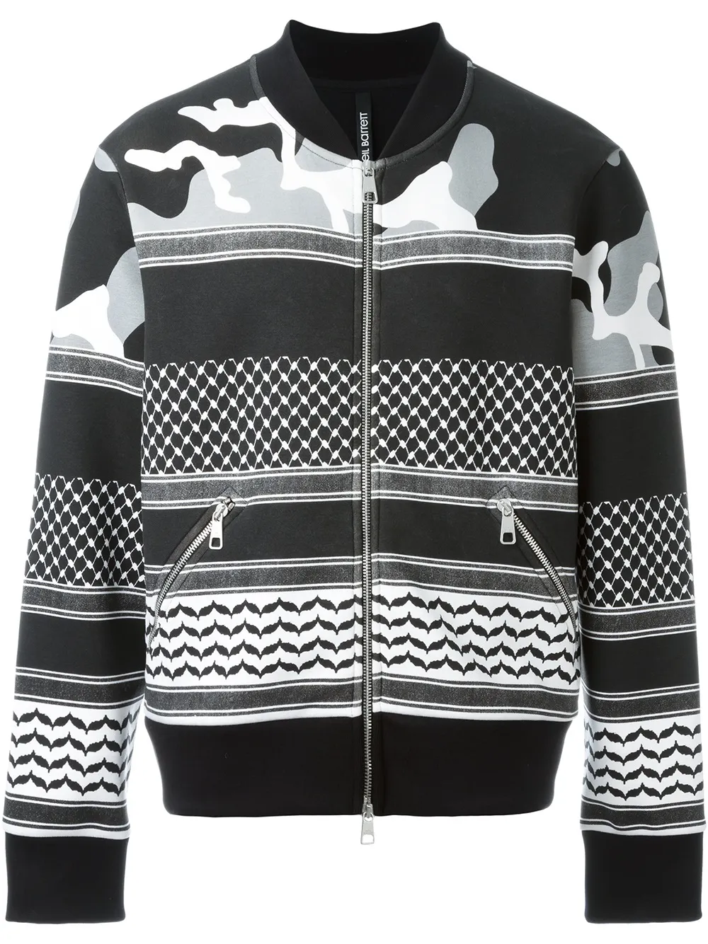 Black and white cotton blend patterned bomber jacket from Neil Barrett featuring a ribbed shawl collar, a front zip fastening, side zipped pockets, long sleeves and a ribbed hem and cuffs.