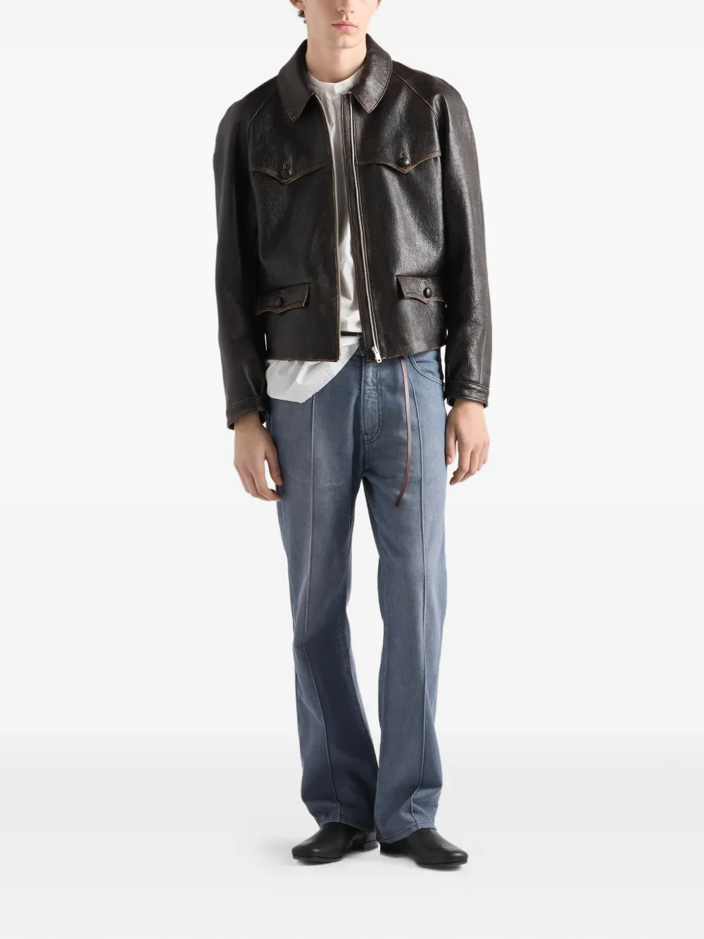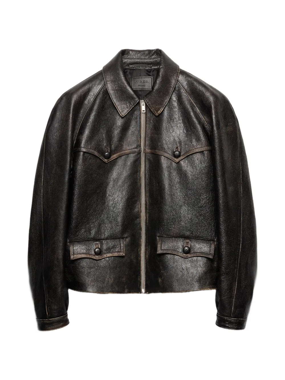Interactions and contrasts between structure and softness, modernity and vintage allure, define this jacket with a distinctive character. The silhouette is emphasized by the soft leather treated with artisan processes to create a vintage effect that adds depth and character to the design.
