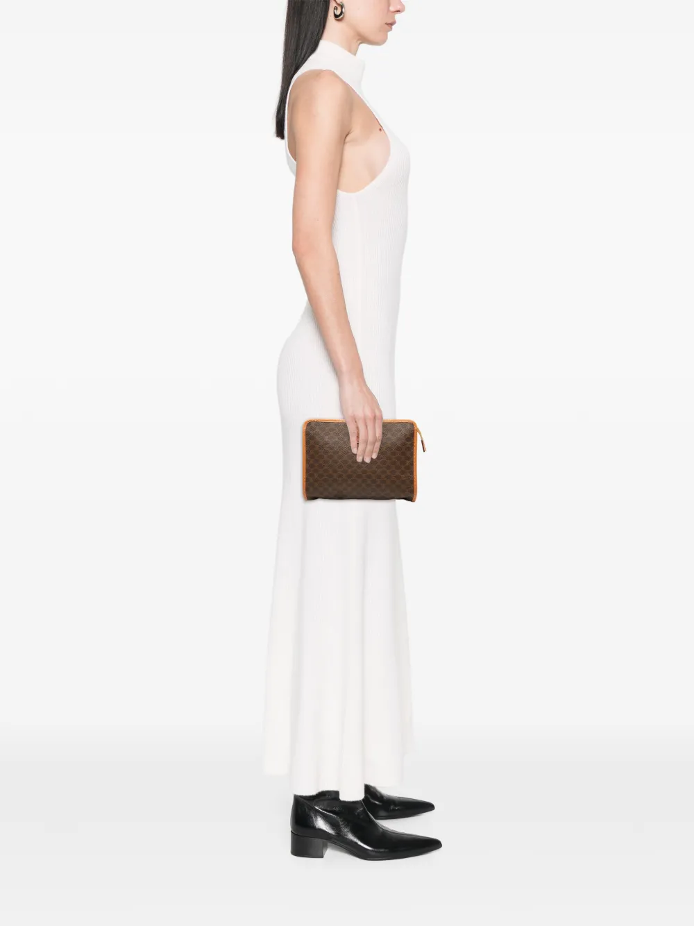 This clutch bag features a coated canvas body with leather trim, and a top zip closure. Brown. Serial Number: M13. This item has no inclusions. Condition: GOOD. This previously owned and used item is in good condition with minimal signs of use. This may include fading of material or plating and scratches. Please refer to the photos on this product page for a detailed view of the item, including any damages declared.