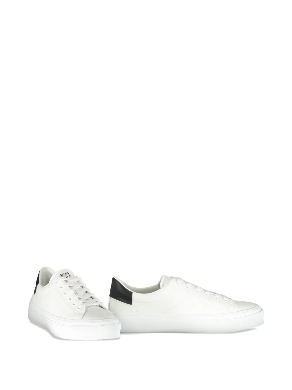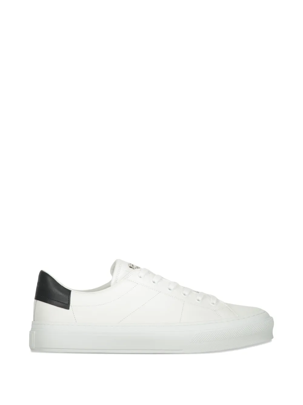 white leather contrasting heel counter logo patch at the tongue front lace-up fastening round toe flat rubber sole