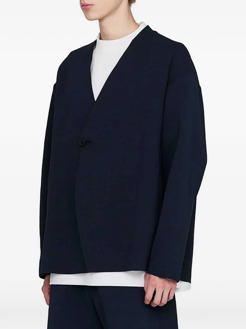 dark navy textured knit single button fastening V-neck long sleeves tonal stitching