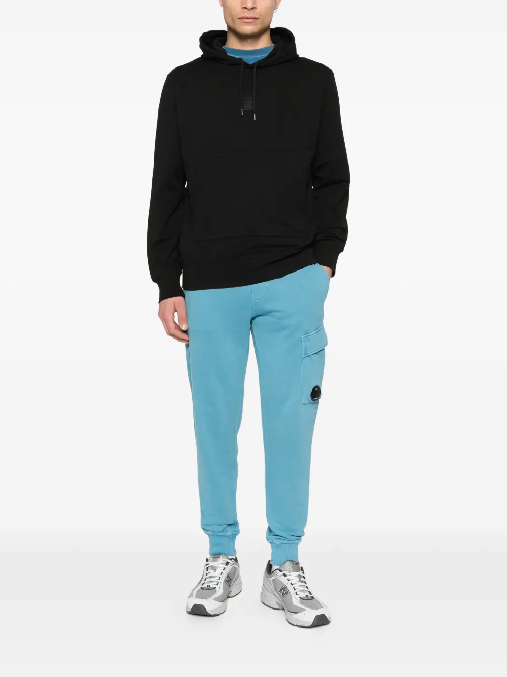 blue elasticated waistband drawstring fastening side cargo pocket Lens detail ribbed ankles
