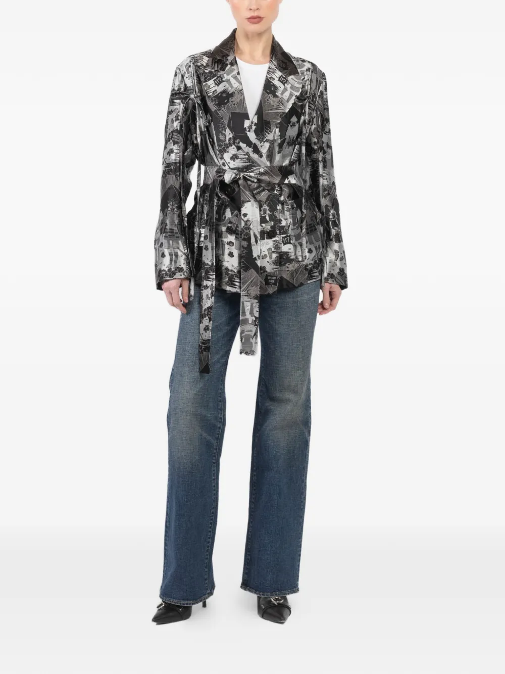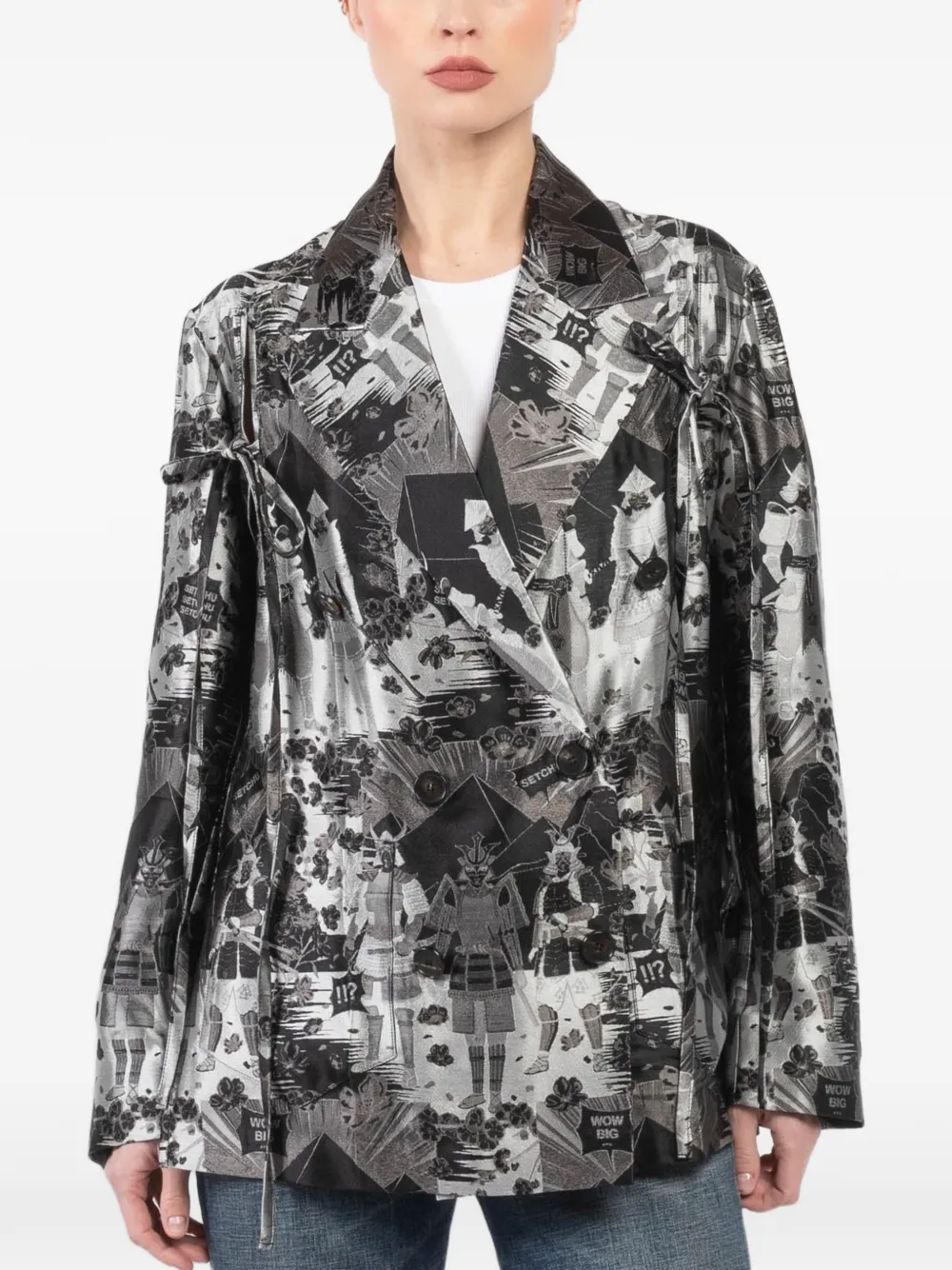 black all-over graphic print long sleeves side tie fastening double-breasted design
