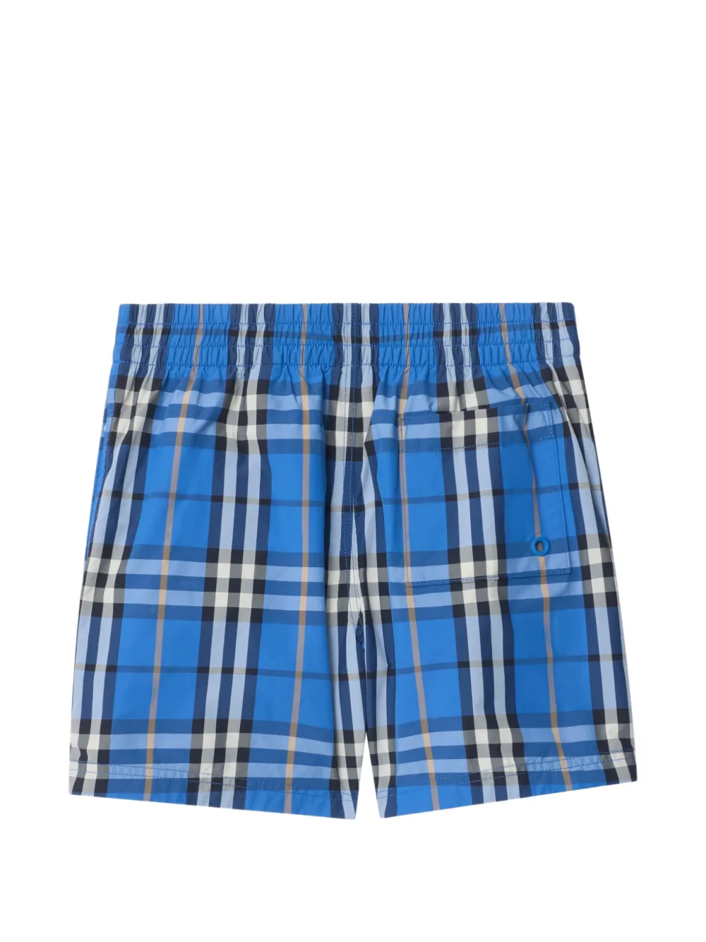 A pair of swim shorts made from nylon with a partial mesh lining. The design is woven with the Burberry Check in seasonal hyacinth blue.