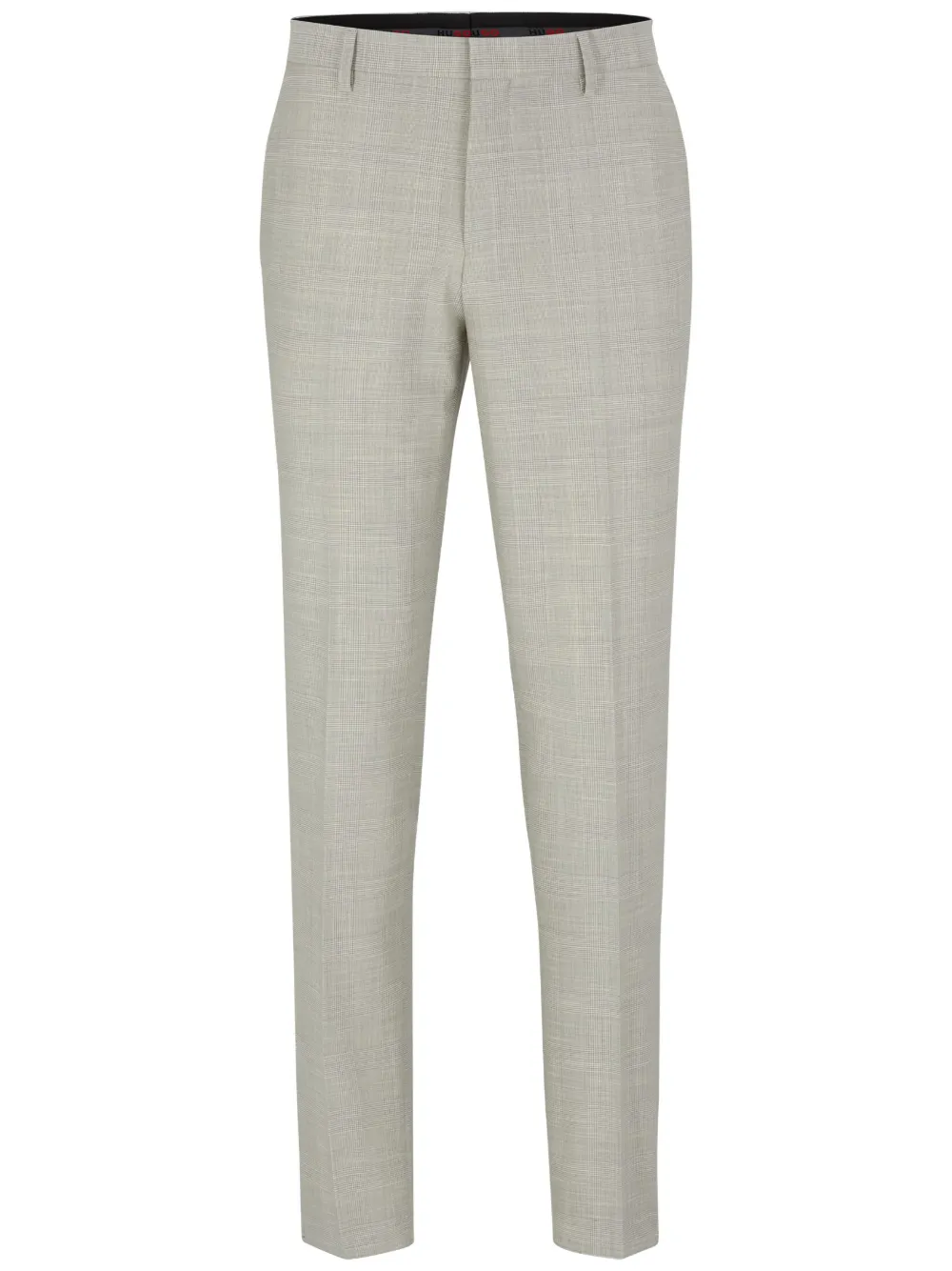Cinza claro, padronagem xadrez Prince of Wales, corte de alfaiataria, corte reto, cintura média, fechamento frontal oculto, passantes para cinto, dois bolsos fenda nas laterais, dois bolsos posteriores com debrum e efeito amassado.