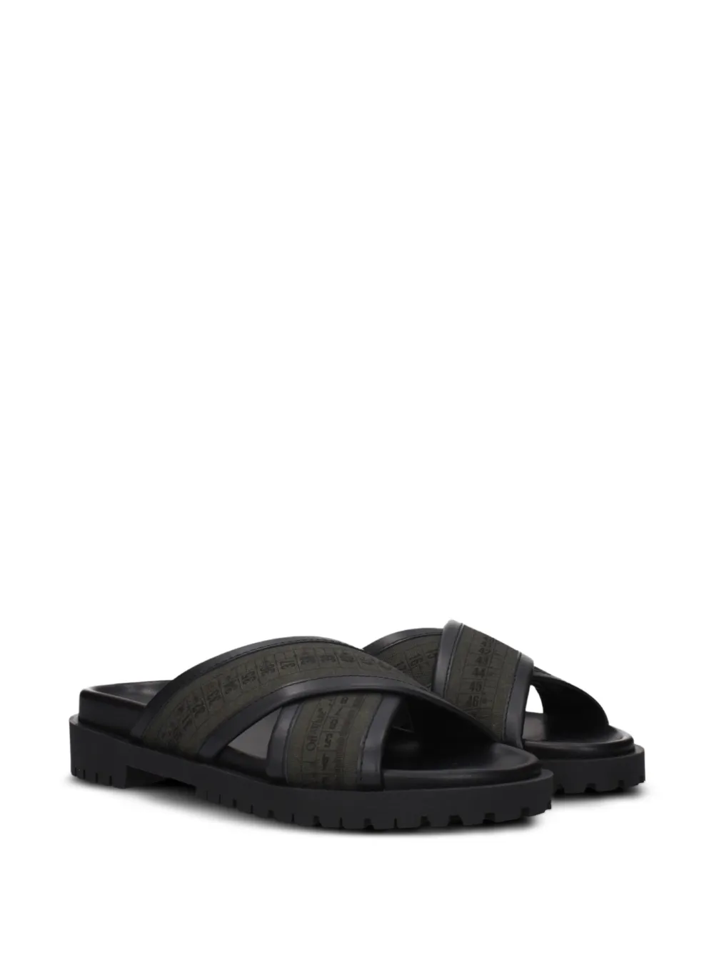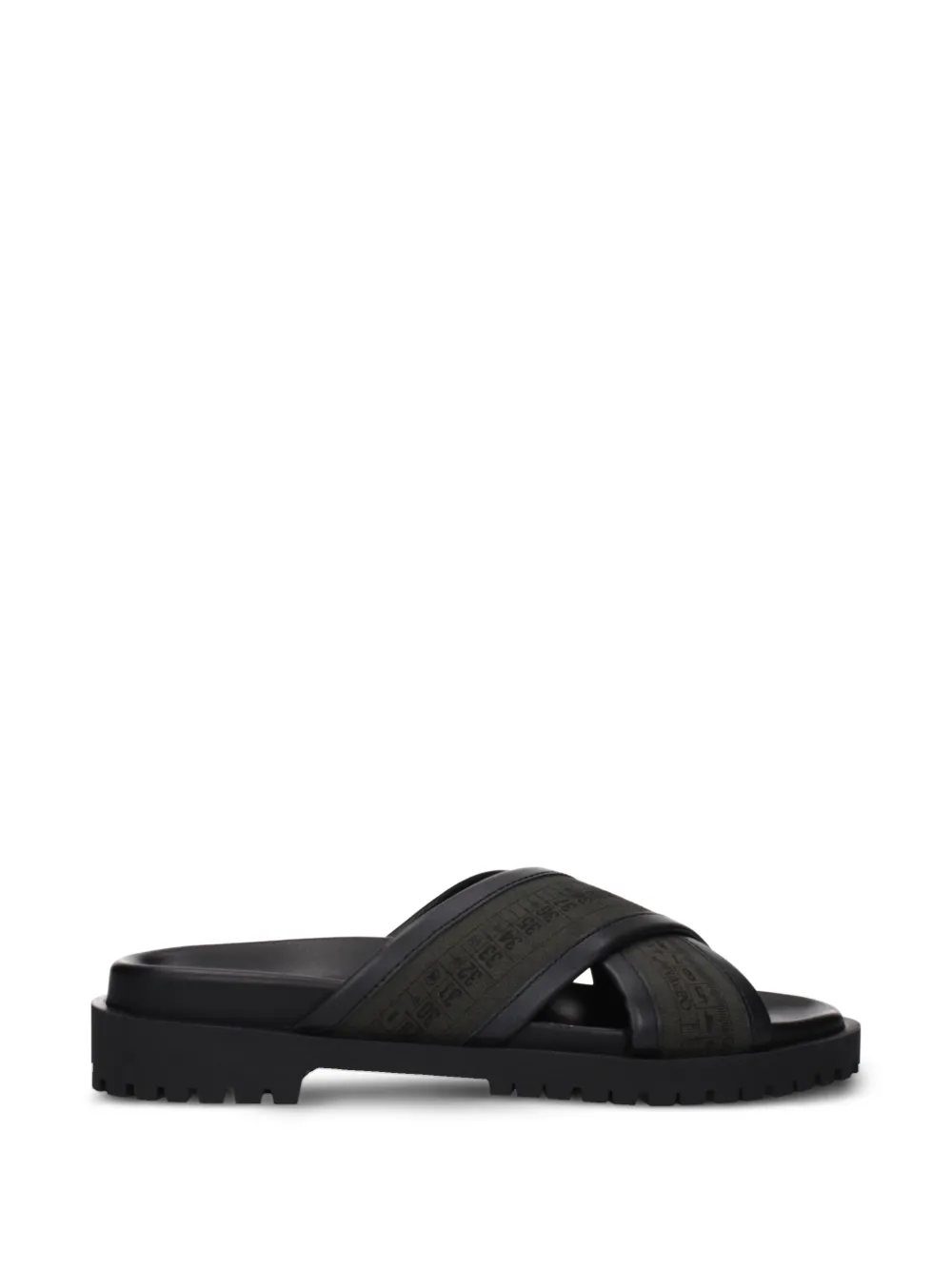 green Industrial belt detailing cross straps open toe slip-on style moulded footbed ridged rubber sole