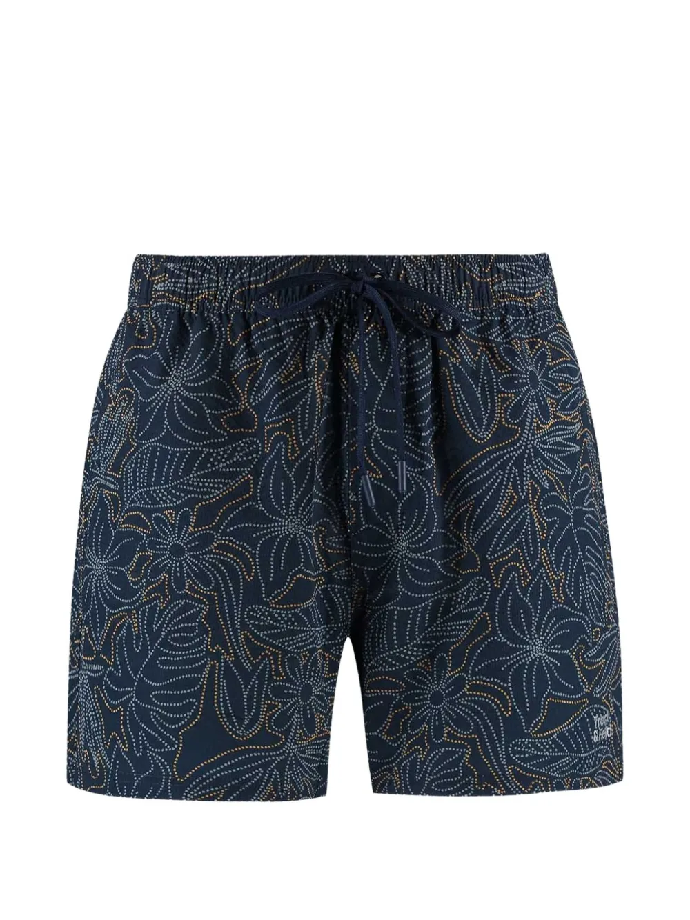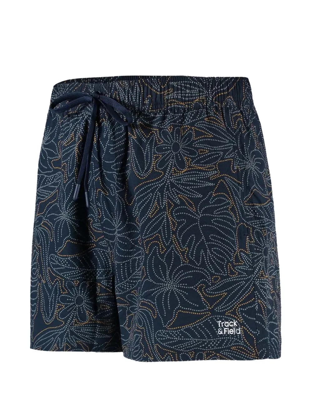 navy blue floral print textured finish elasticated drawstring waistband two side slit pockets logo print to the front