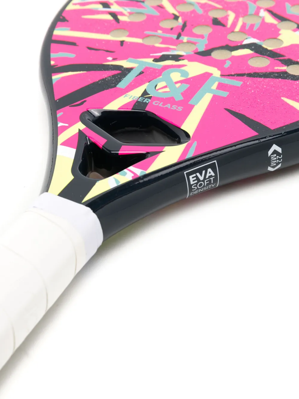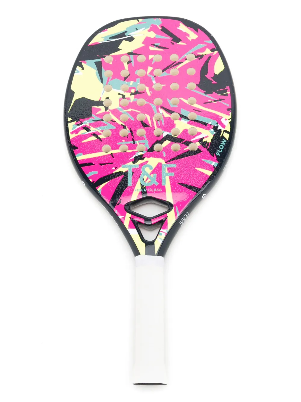 Preto e colorido, estampa corrida gráfica, estampa frontal de logo e estrutura oval.