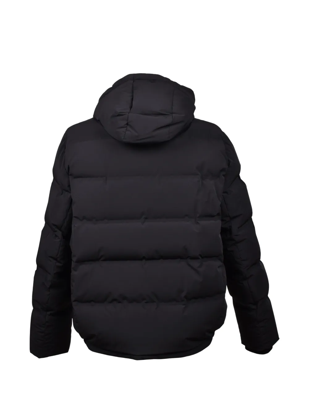 jet black quilted finish drawstring hood front zip fastening long sleeves ribbed cuffs silver-tone hardware