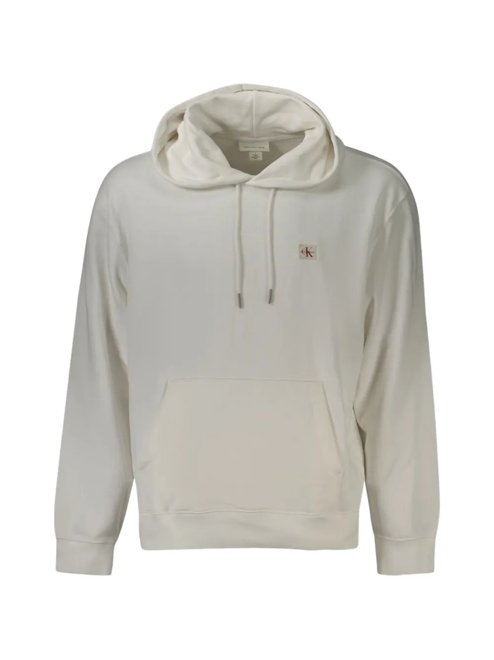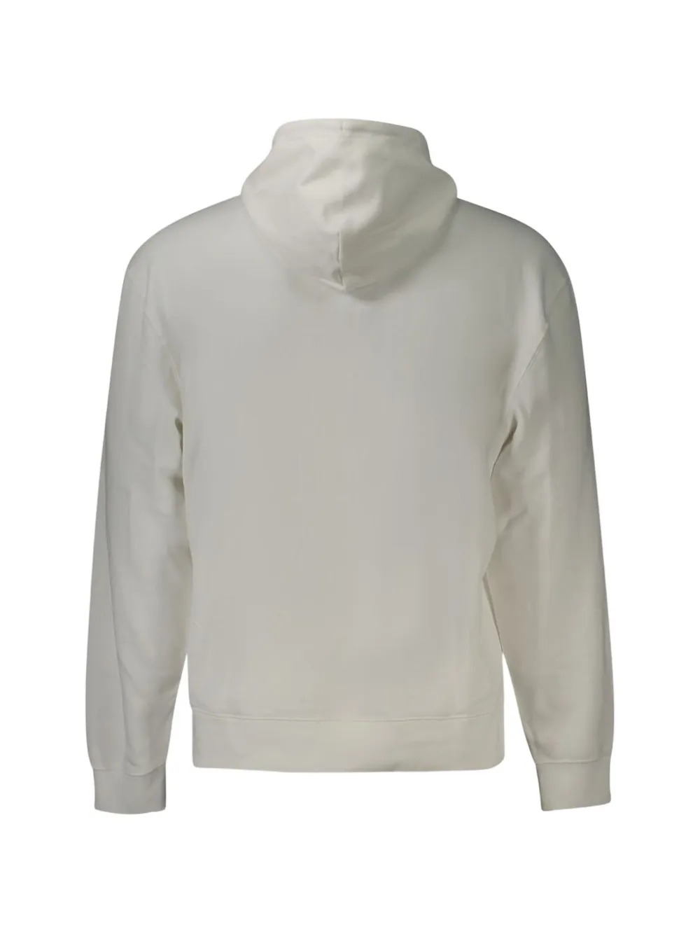 white jersey texture drawstring hood logo patch at the chest kangaroo pocket long sleeves ribbed cuffs ribbed hem relaxed fit