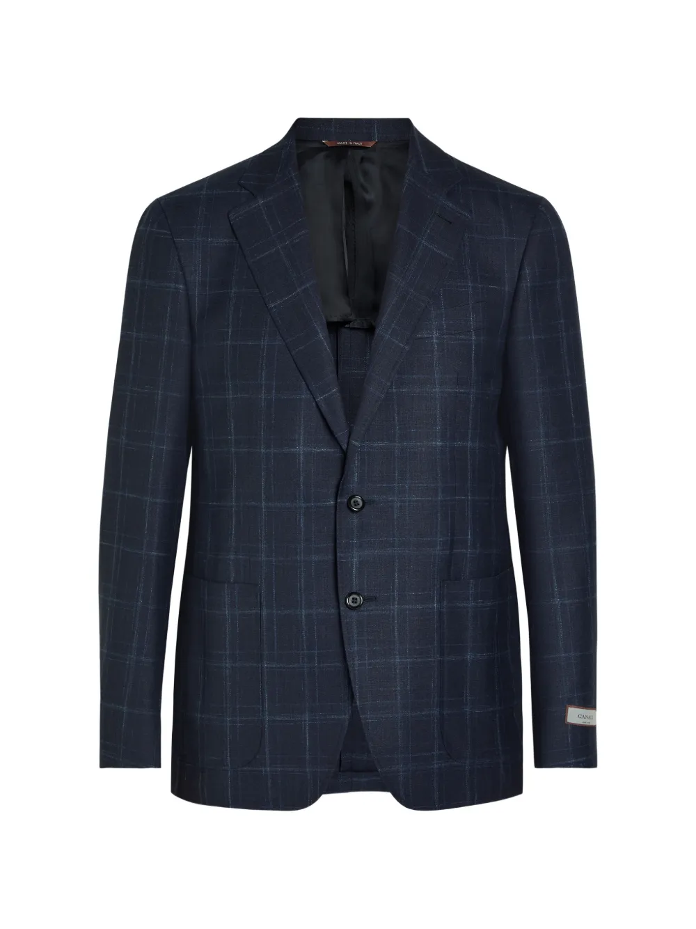 dark blue notched lapels two front pockets two-button fastening long sleeves buttoned cuffs