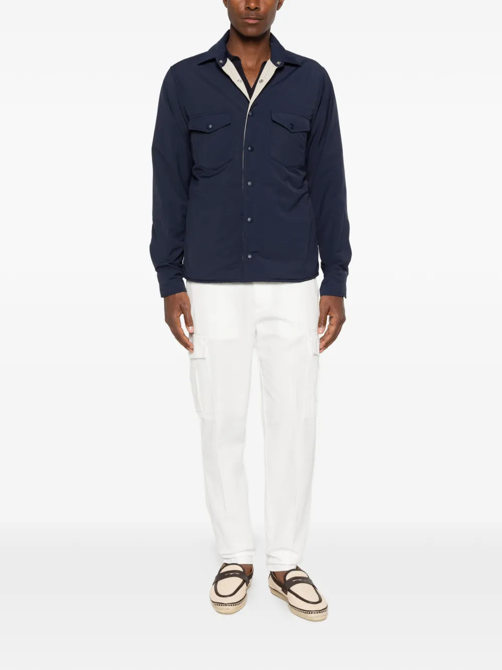 navy blue classic collar front press-stud fastening two chest flap pockets long sleeves