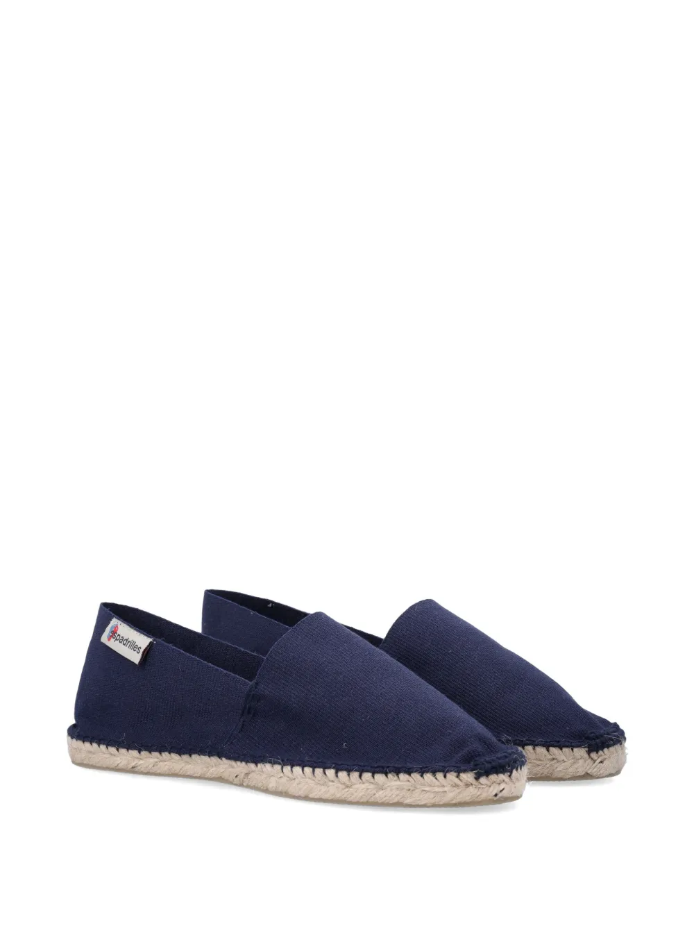 navy blue canvas texture logo patch to the side round toe braided raffia sole slip-on style