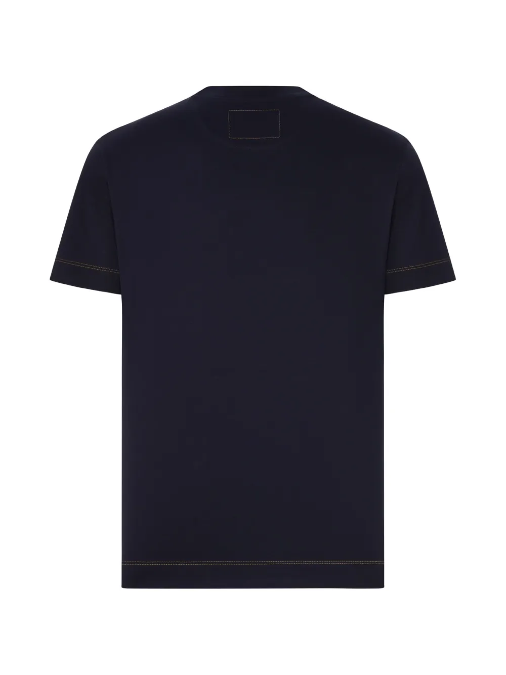 dark blue cotton logo patch patch pocket contrast topstitching crew neck short sleeves straight hem
