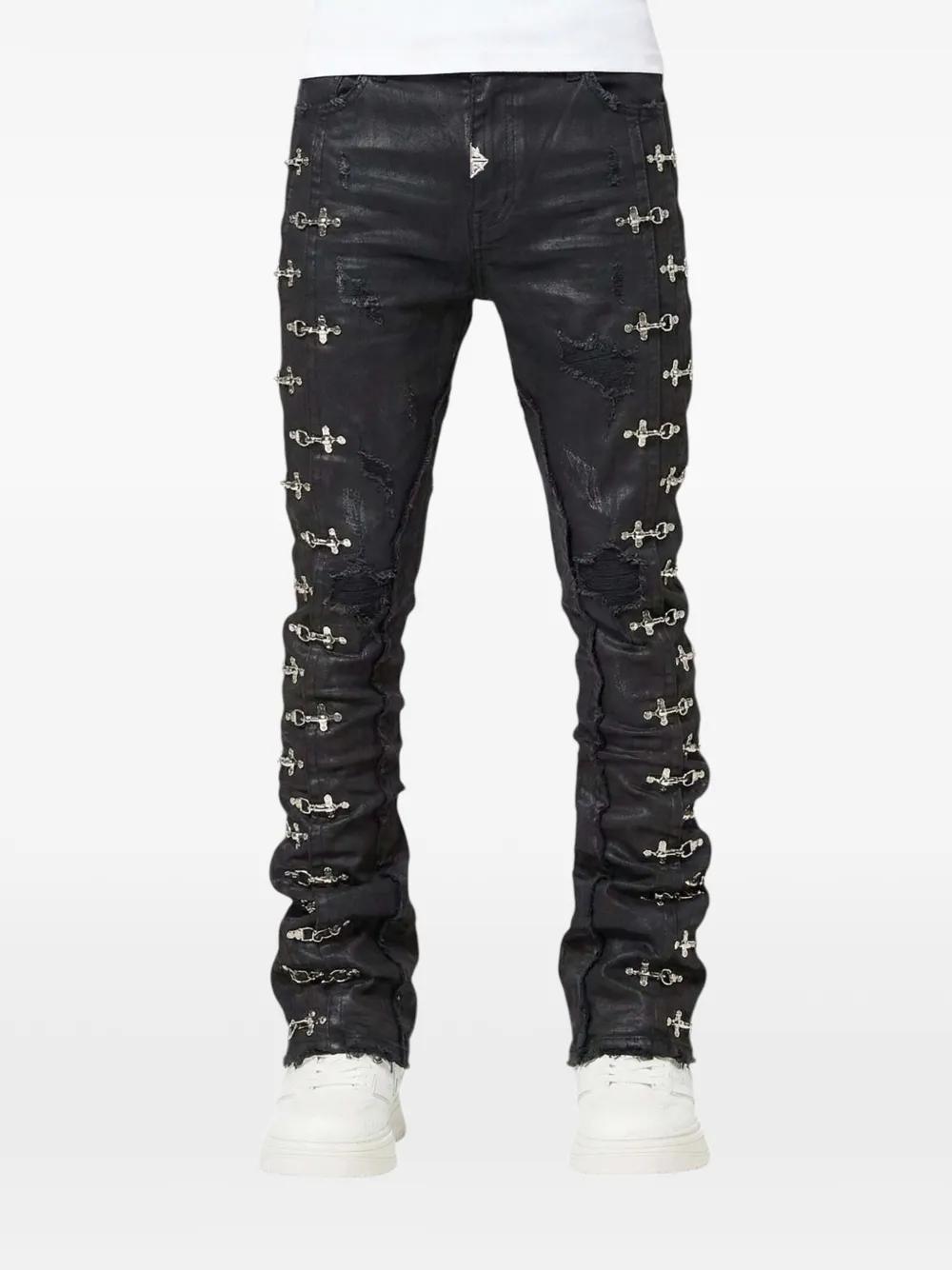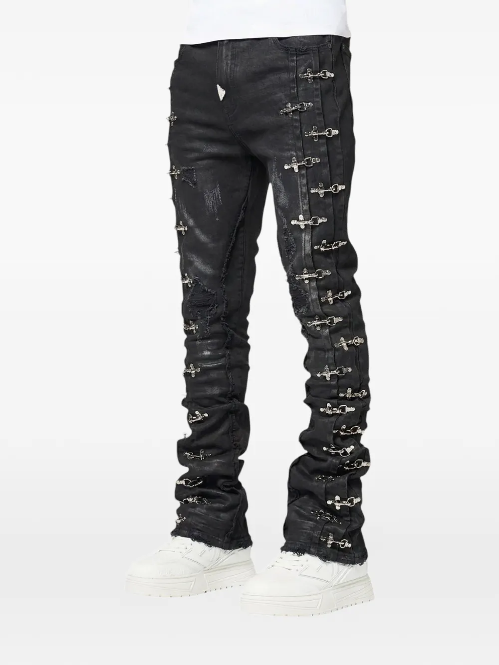 black waxed finish whiskering effect distressed finish aviation clasp hardware five-pocket design zip fly and button fastening slim fit