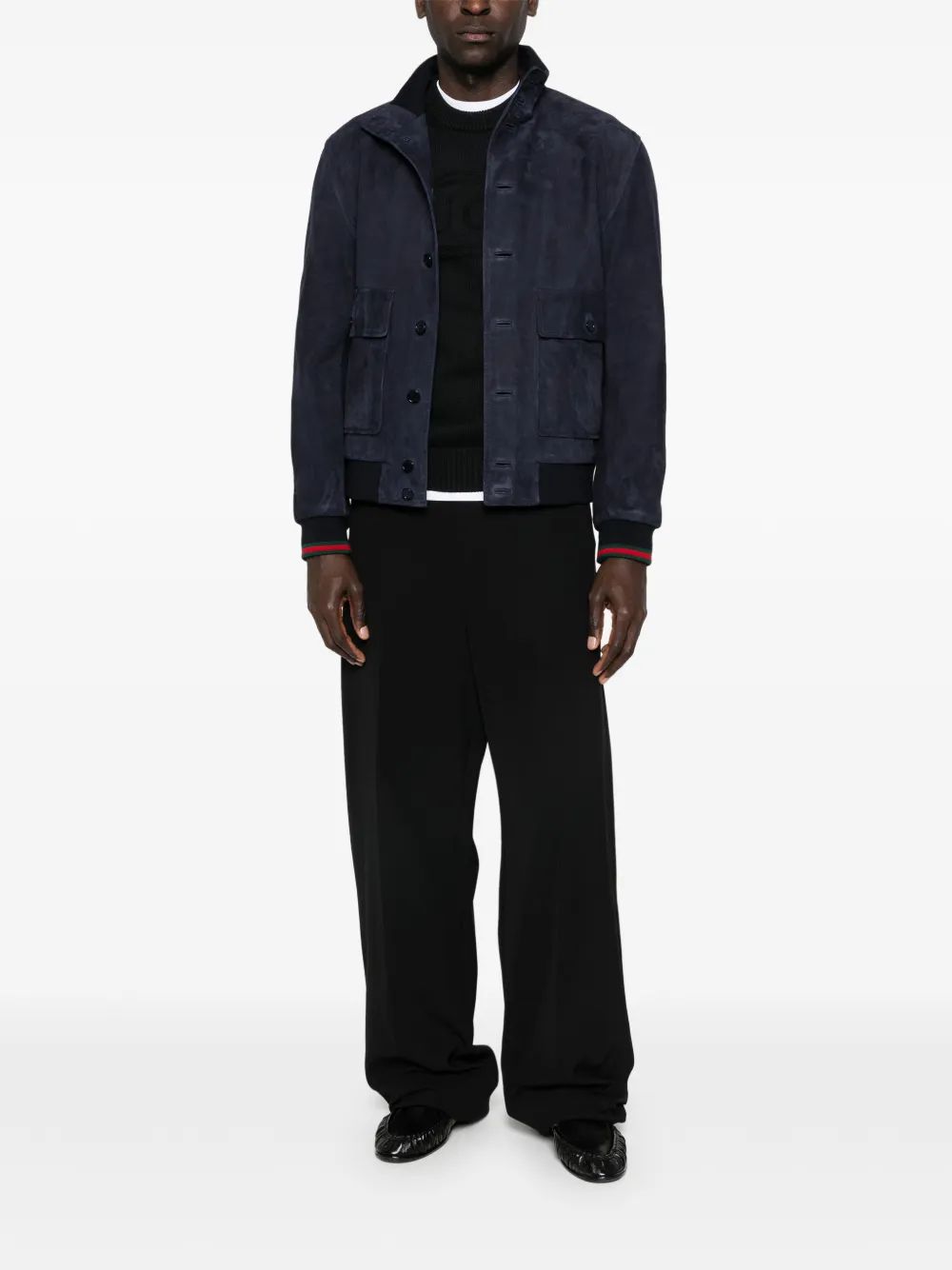 <ul><li>blue</li><li>ribbed hem</li><li>button closure</li><li>front flap pockets</li><li>ribbed cuffs</li><li>stand-up collar</li></ul>