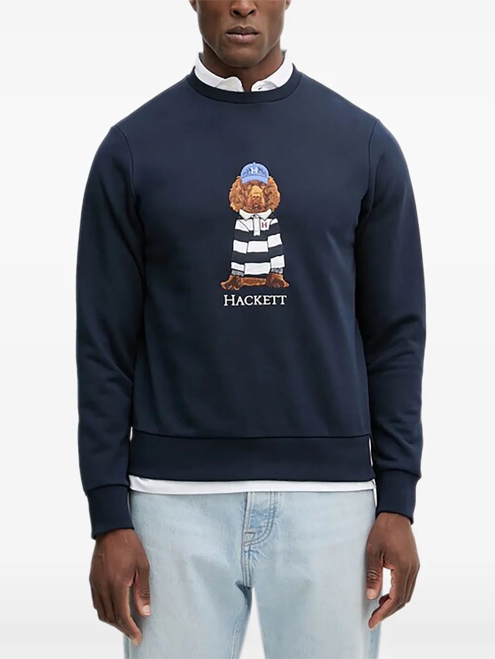 navy blue dog graphic crew neck long sleeves ribbed trim