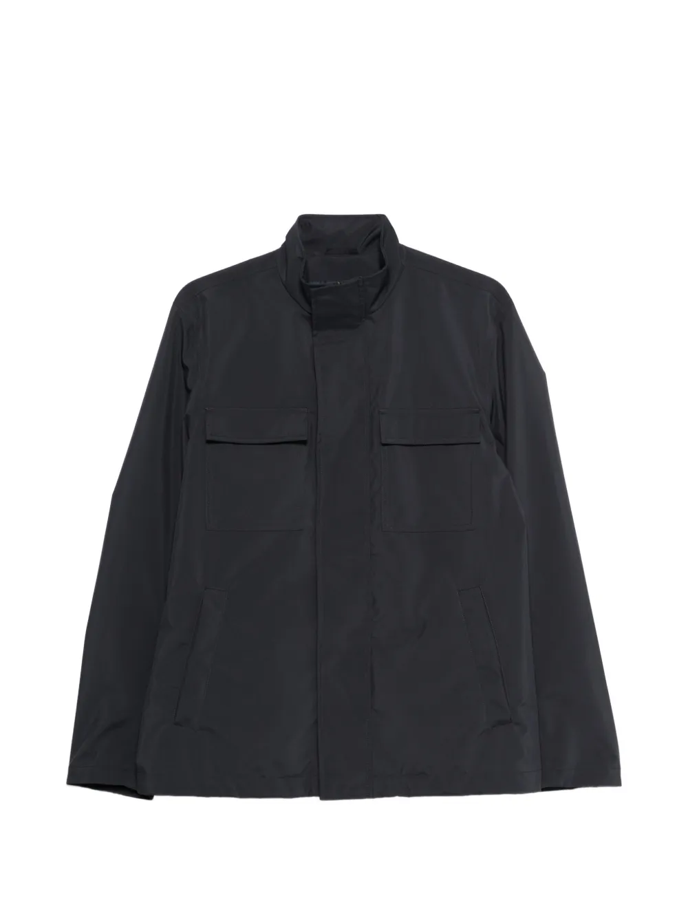 blue raised neck flap pockets concealed front fastening long sleeves straight hem