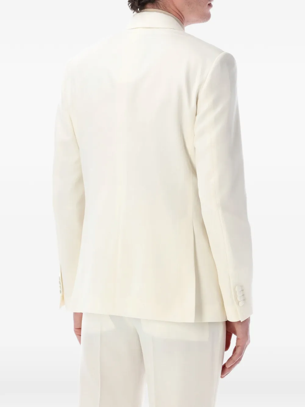 white six-button fastening double-breasted peak lapels welt pocket flap pockets