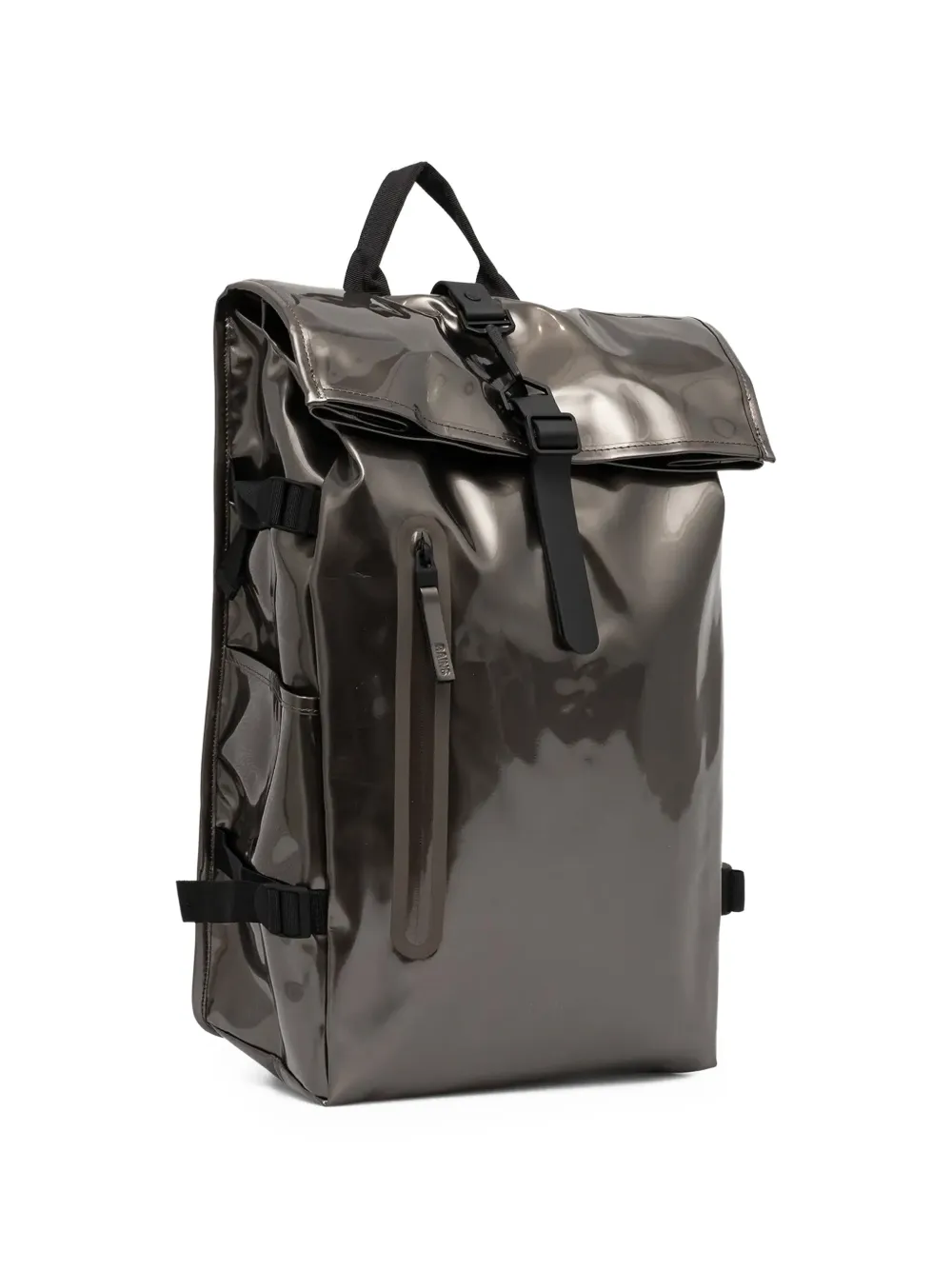gunmetal tone top handle buckle fastening front zip pocket adjustable straps side slip pockets