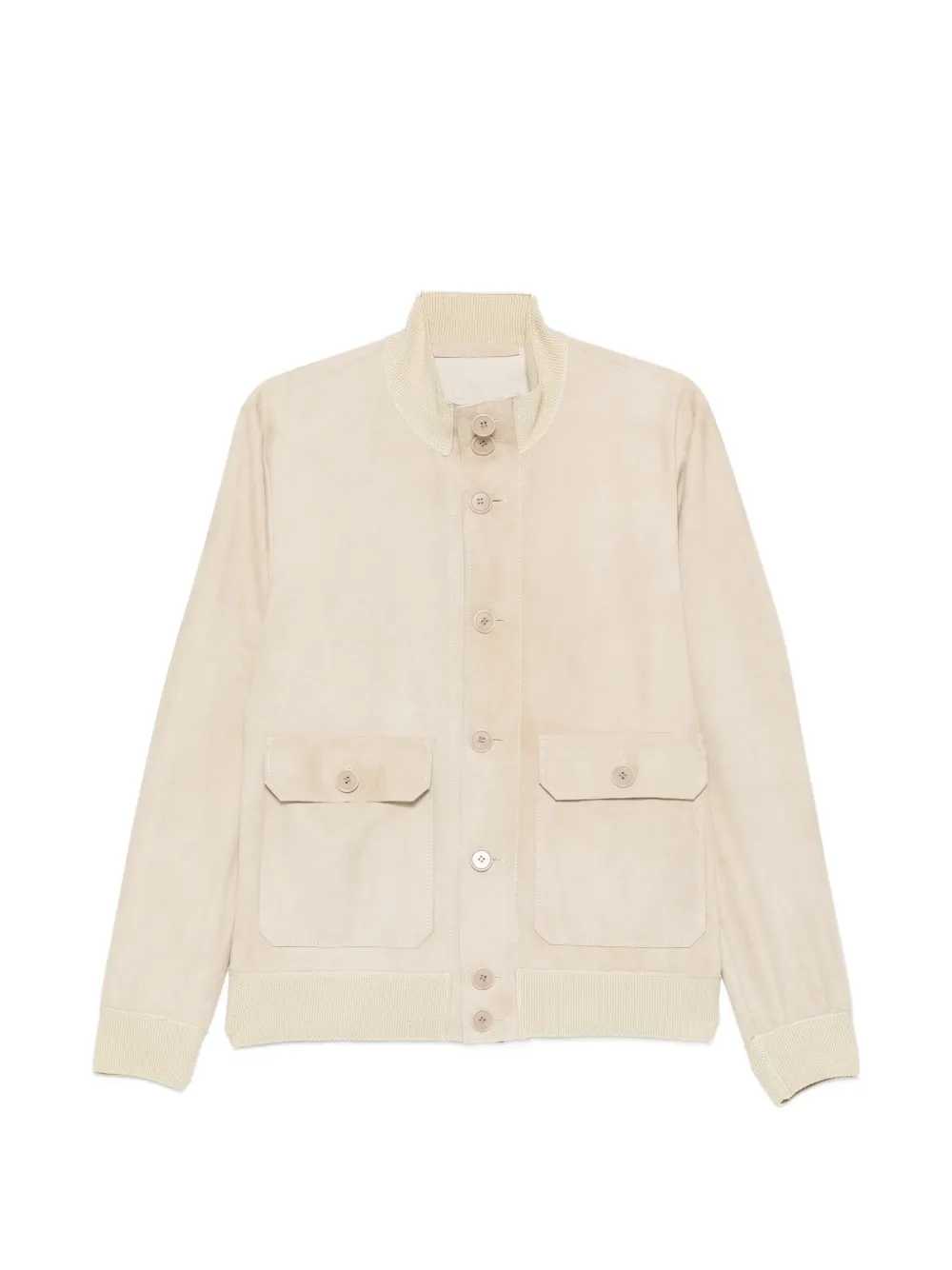 beige suede ribbed trims front button fastening two front patch pockets high neck