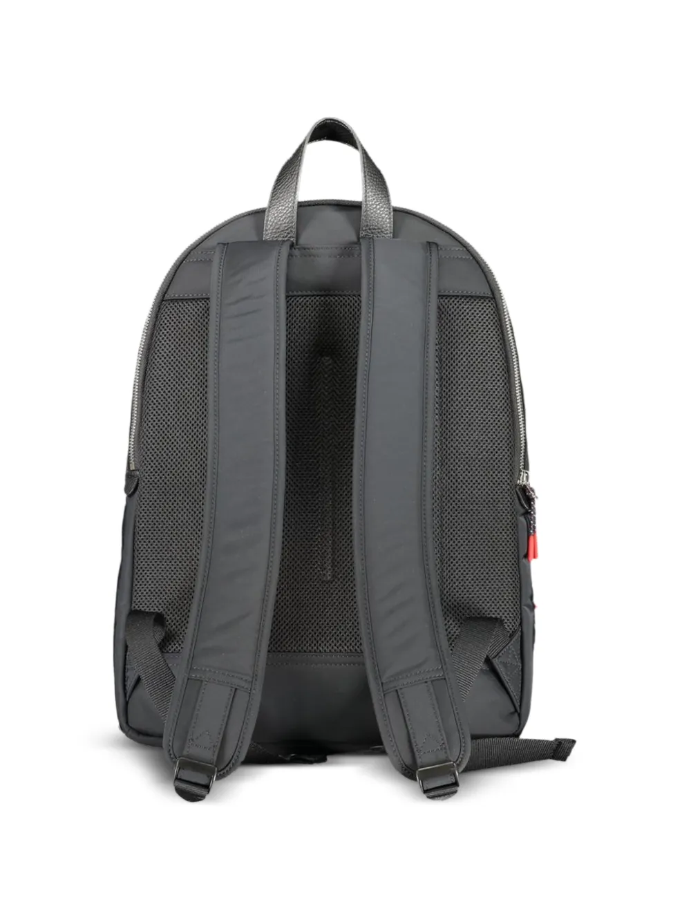 black logo-patch at front top zip-fastening front zip-fastening pocket single flat top-handle adjustable shoulder straps mesh back panel silver-tone hardware