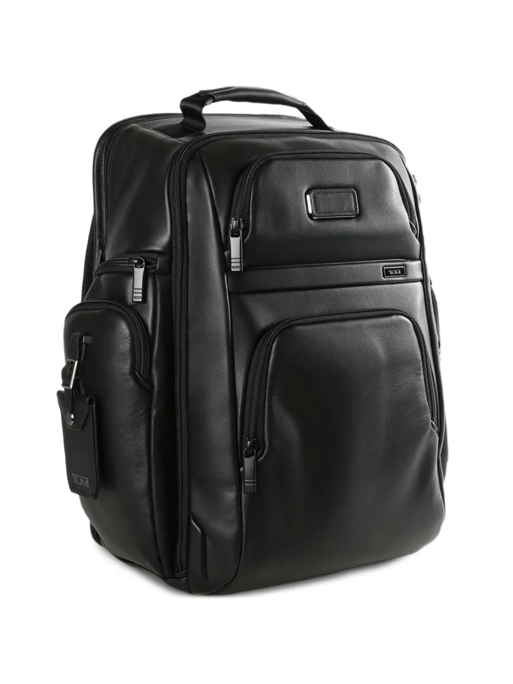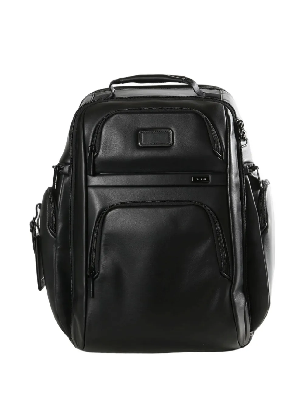 black smooth grain single flat top handle two adjustable padded shoulder straps multiple front zip-fastening pockets two side zip-fastening pockets logo plaque to the front detachable luggage tag zip-around fastening silver-tone hardware