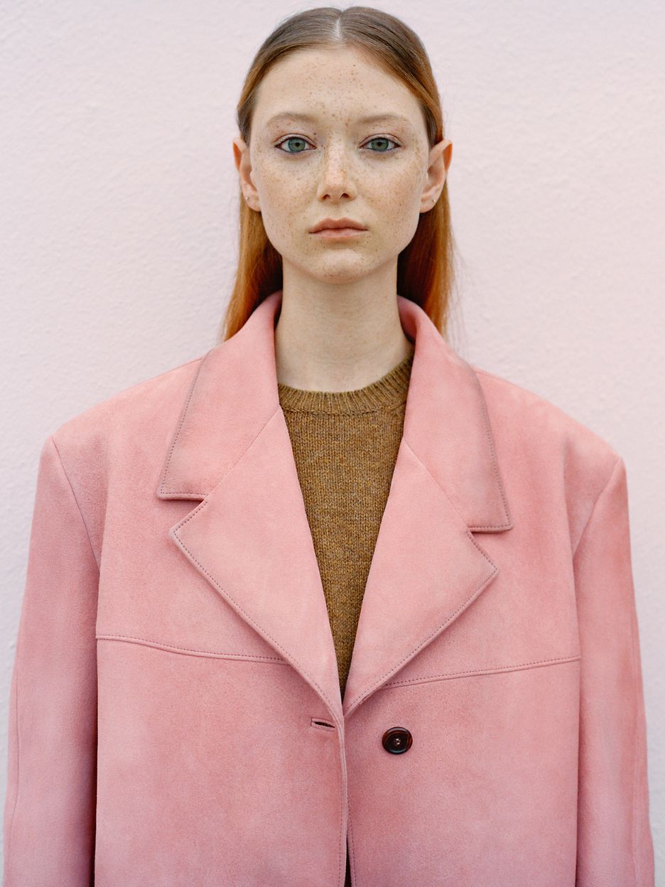 « Le co-directeur artistique Raf Simons décrit la nouvelle collection Prada comme de la "haute couture à porter au quotidien". Elle est animée de silhouettes épurées et intemporelles, rehaussées de touches originales. La simplicité d'une veste de tailleur rehausse instantanément votre look, surtout lorsqu'elle est confectionnée en daim rose ultra-doux. »