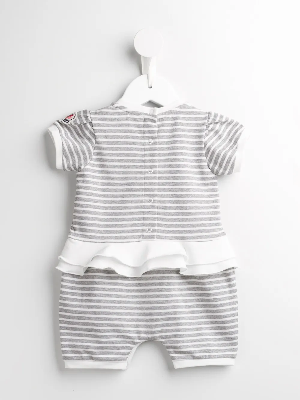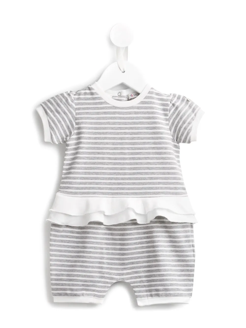 Whether it’s a skisuit for those very first steps on the slopes or a down jacket for keeping out those city chills, Moncler Kids is the go-to for luxuriously warm kidswear and preppy inspired staples. These grey and beige stretch cotton striped shorties from MONCLER KIDS feature a round neck, short sleeves, a ruffled design, a snap fastening and a logo patch.
