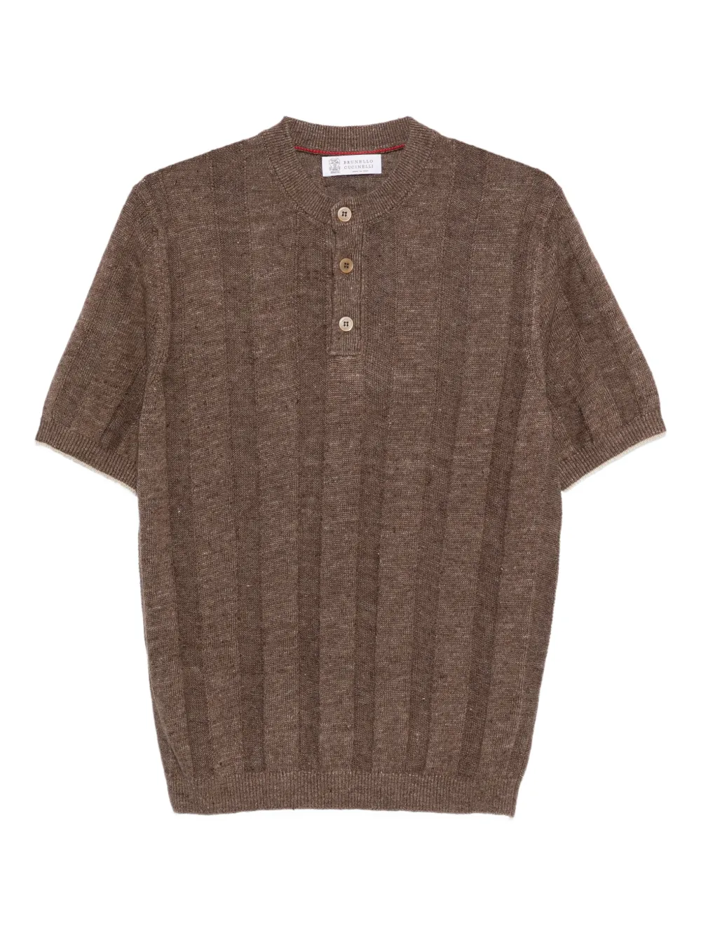 brown ribbed trims button fastening short sleeves round neck