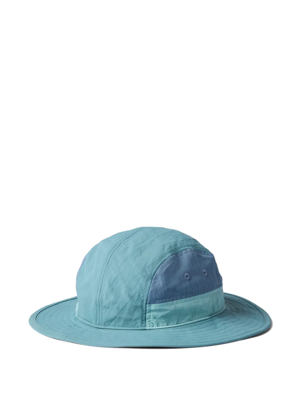 blue panelled design logo patch to the front eyelet vents chin strap toggle fastening wide brim