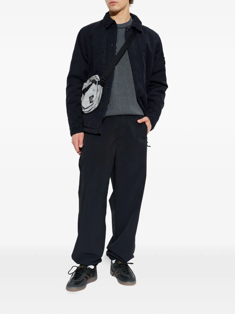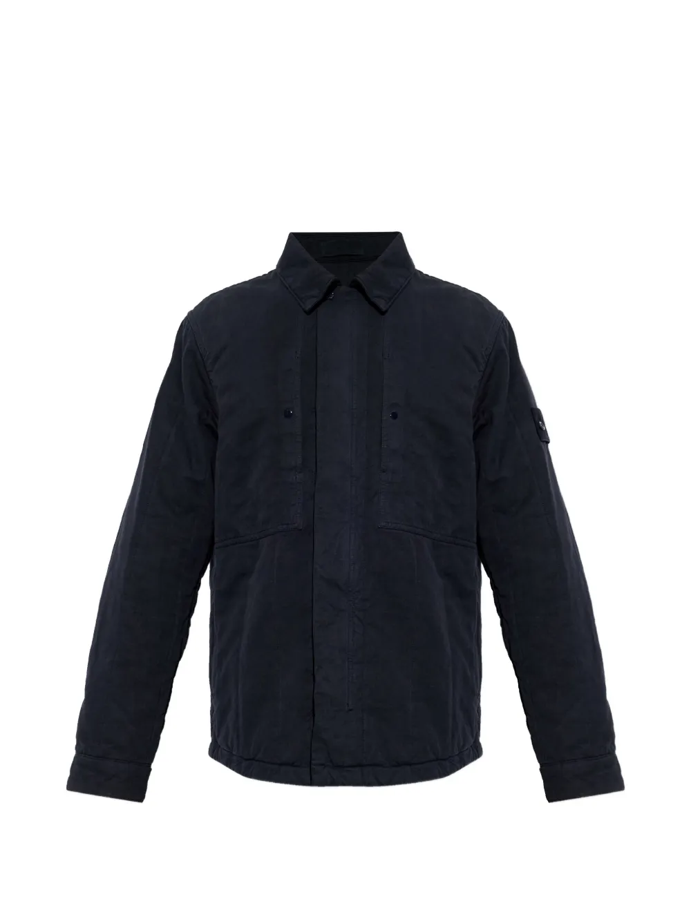 navy blue button fastening two front pockets logo patch