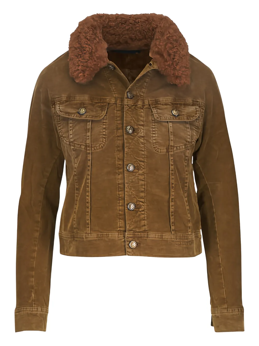 brown corduroy texture faux fur collar front button fastening chest flap pockets buttoned cuffs