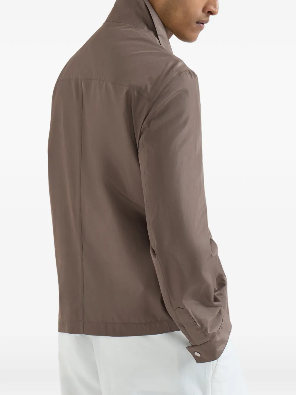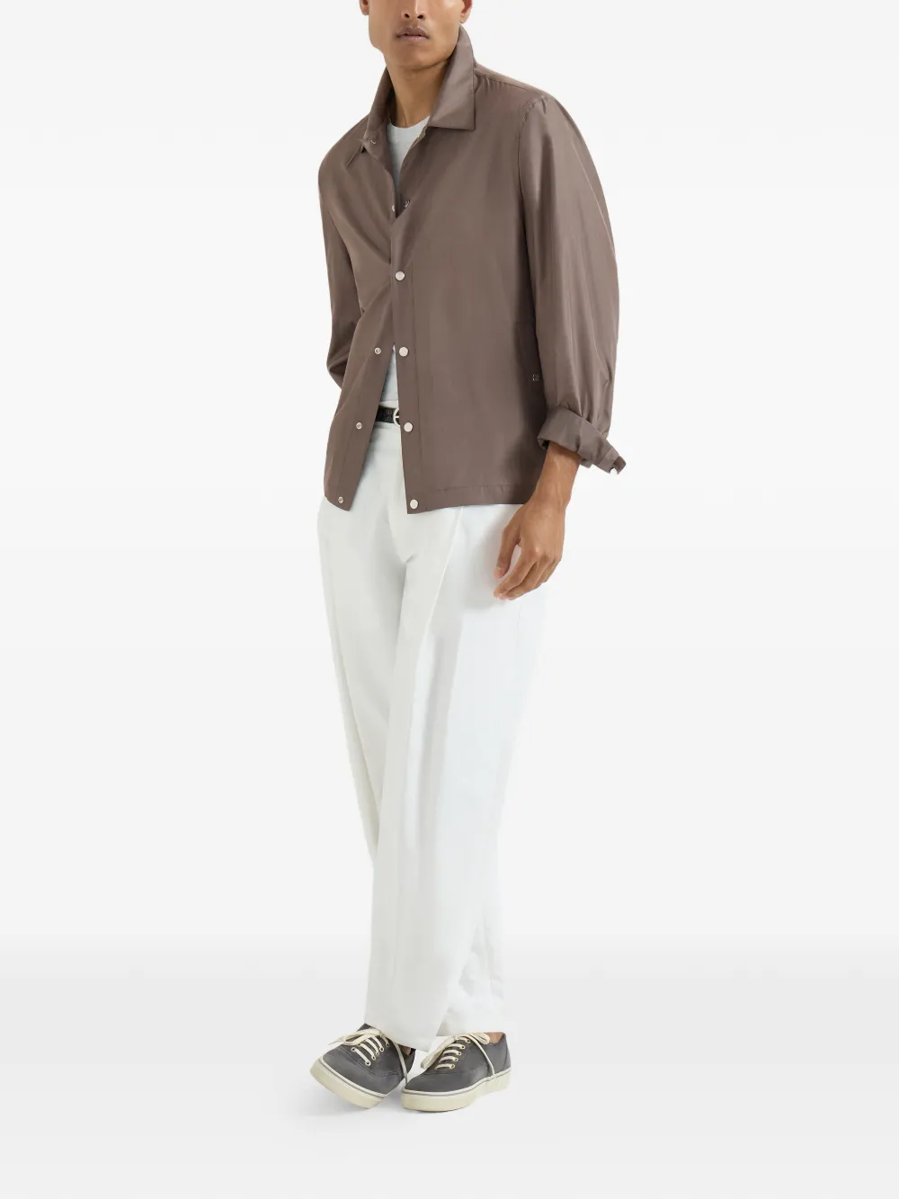 轻盈感与流动性,在这款轻薄粘合真丝外套中定义了男装设计的全新愿景。这款混合廓形夹克吸纳了正装剪裁的灵感,采用全无内里设计以应对暖意时节;丝绸的粼粼光泽与内层薄膜的防护性能交相辉映,赋予其丰富的穿着内涵。这款衬衫领设计搭配按扣,呈现出标准且舒适的剪裁比例。