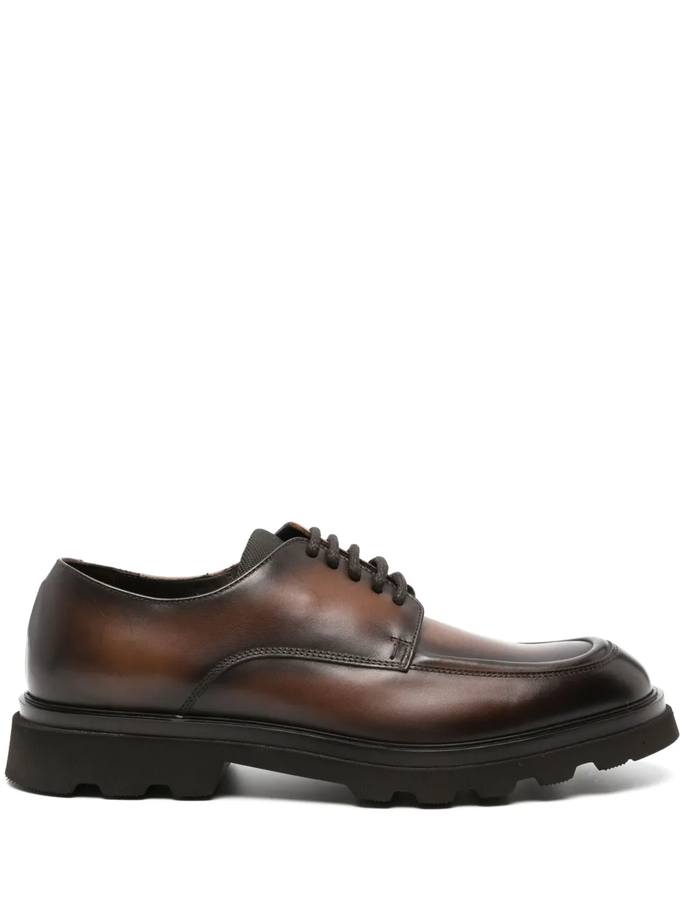 巧克力色、小牛皮、光滑粒纹、抛光效果、正面系带、圆头、鞋垫饰有标志、橡胶厚底。