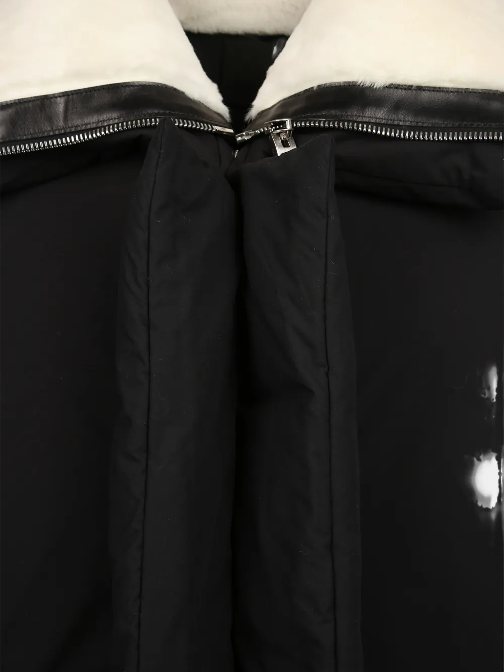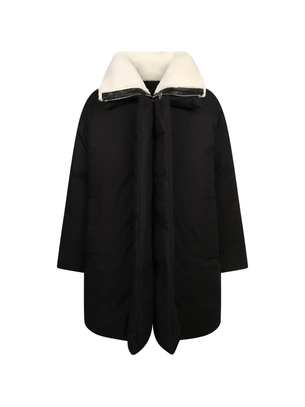 设计细节:黑色、人造皮草边饰、立领、羽绒填充、隐藏式摁扣、两个侧置平袋、长袖。