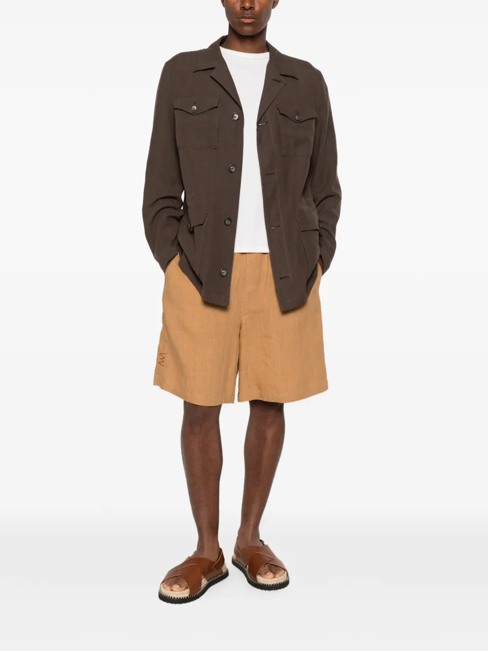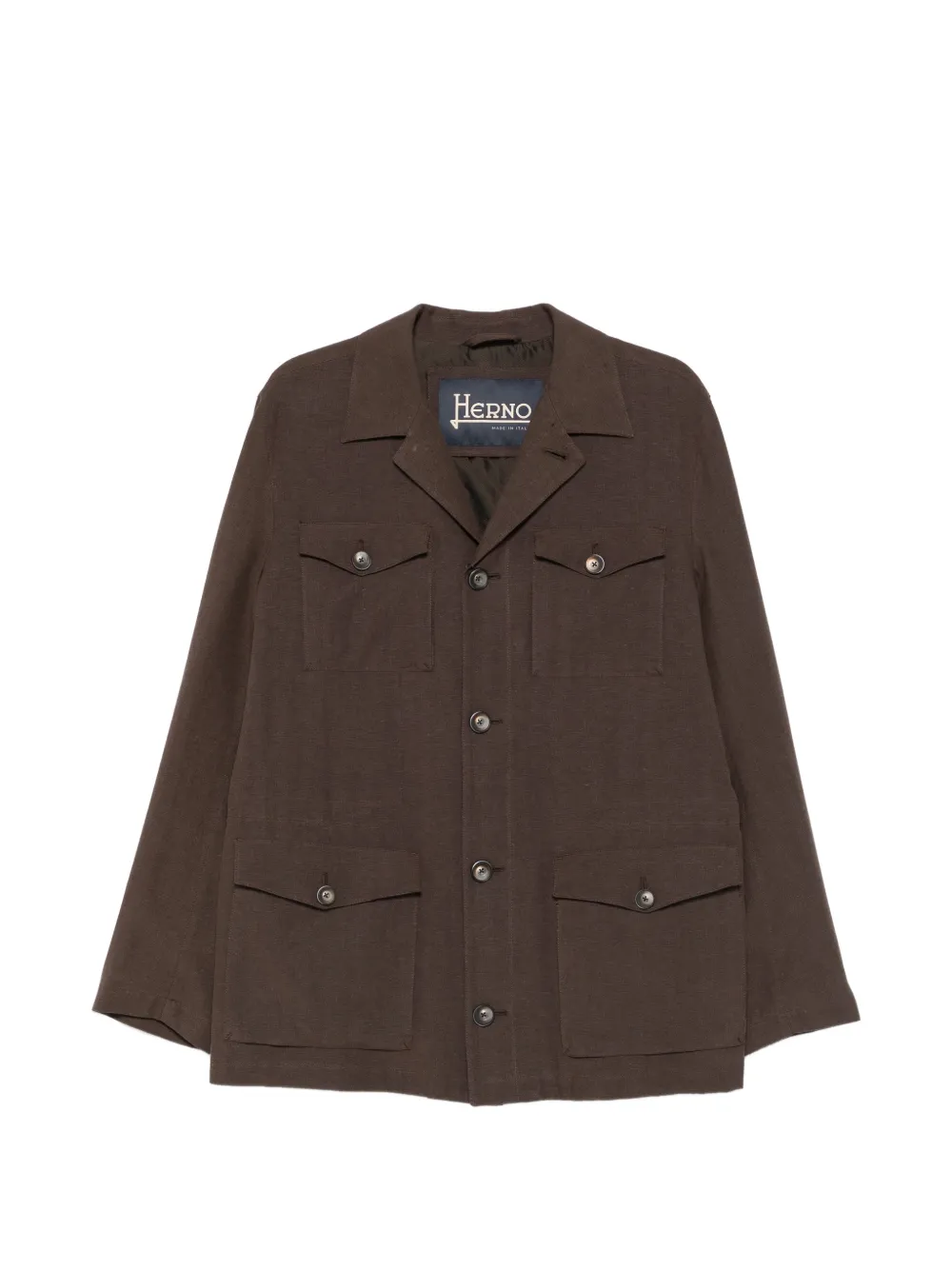 dark brown notched lapels front button fastening long sleeves two chest flap pockets two front flap pockets straight hem