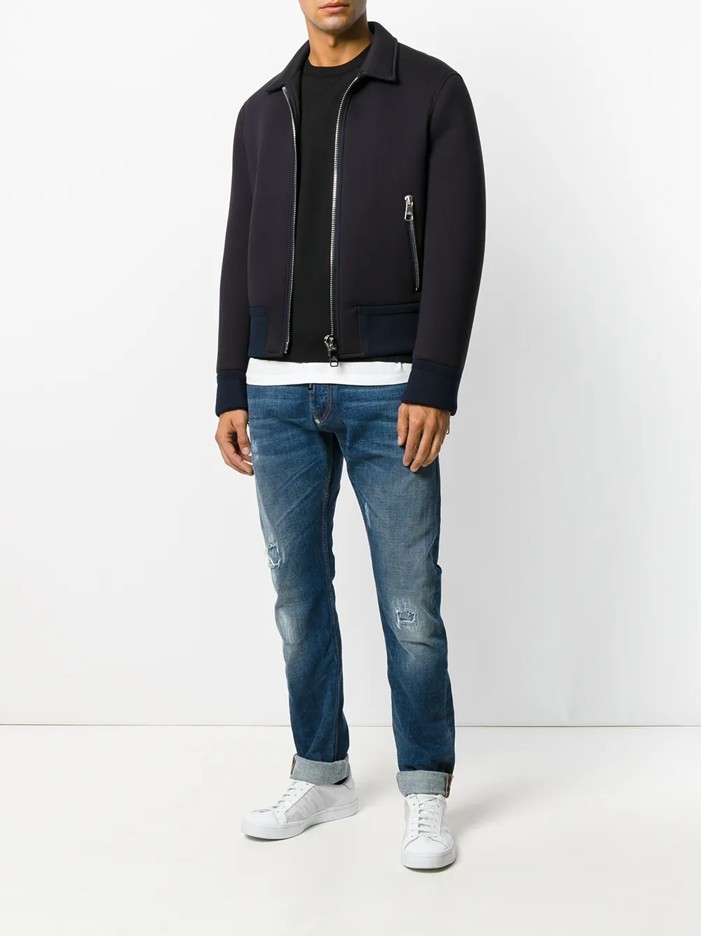 Philipp Plein 蓝色 棉质混纺 仿旧修身牛仔裤。 系腰带袢腰边, 褪色效果, 纽扣与拉链, 仿旧效果, 大腿处有胡须状条纹, 五口袋设计。