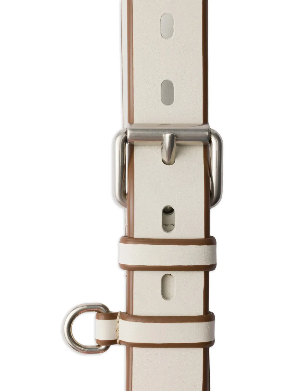 该腰带设计独特,融合了匠心工艺与现代风格。单品以饰有金属扣环的皮质制成,边缘形成鲜明对比。
