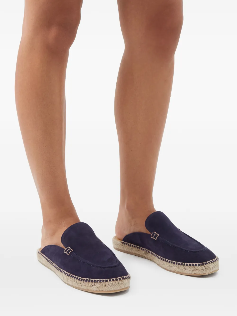 海军蓝色、绒面皮、杏仁鞋头、黄麻鞋底、穿套式、橡胶平底、logo皮质鞋垫。