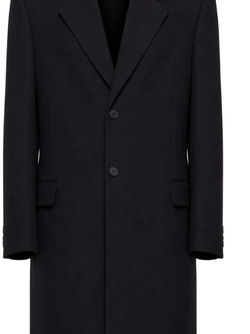 black notched lapels two front buttons front flap pockets buttoned cuffs