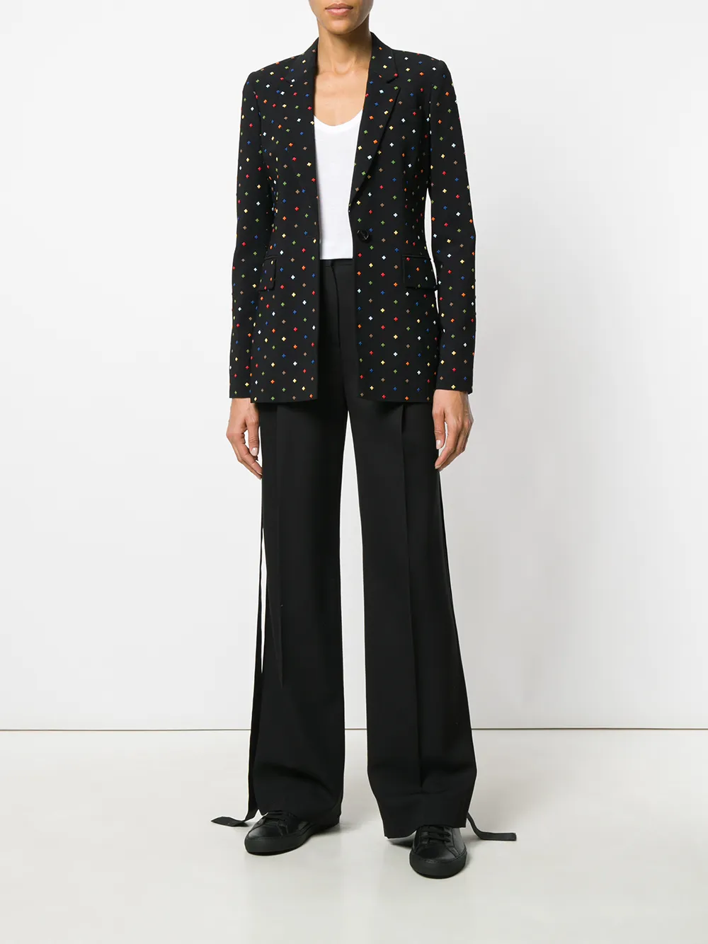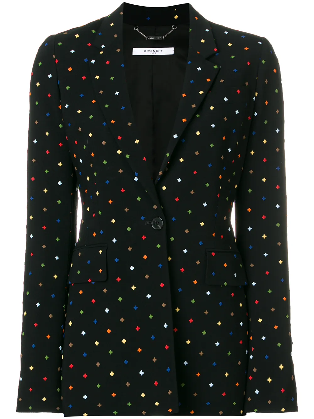 Givenchy (纪梵希) 黑色与多色 迷你十字西装夹克。 梯形翻领, 胸袋, 正面纽扣, 两个正面盖袋, 长袖, 搭扣细节, 中后背开衩, 平直下摆, 全衬里。