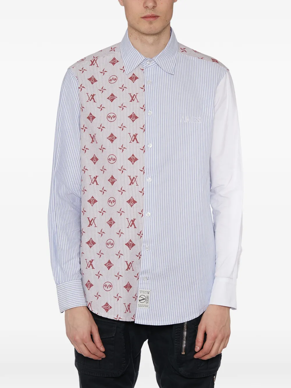 lue/multicoloure patchwork striped left chest embroidery long sleeves button fastening