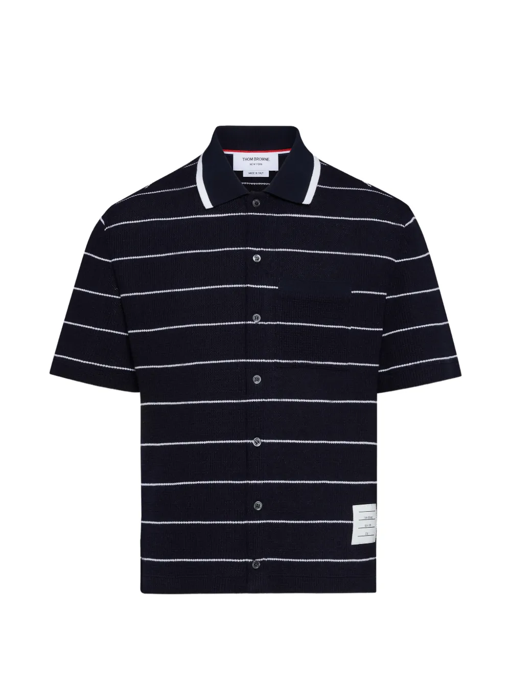 navy blue striped waffle knit chest pocket short sleeves button fastening