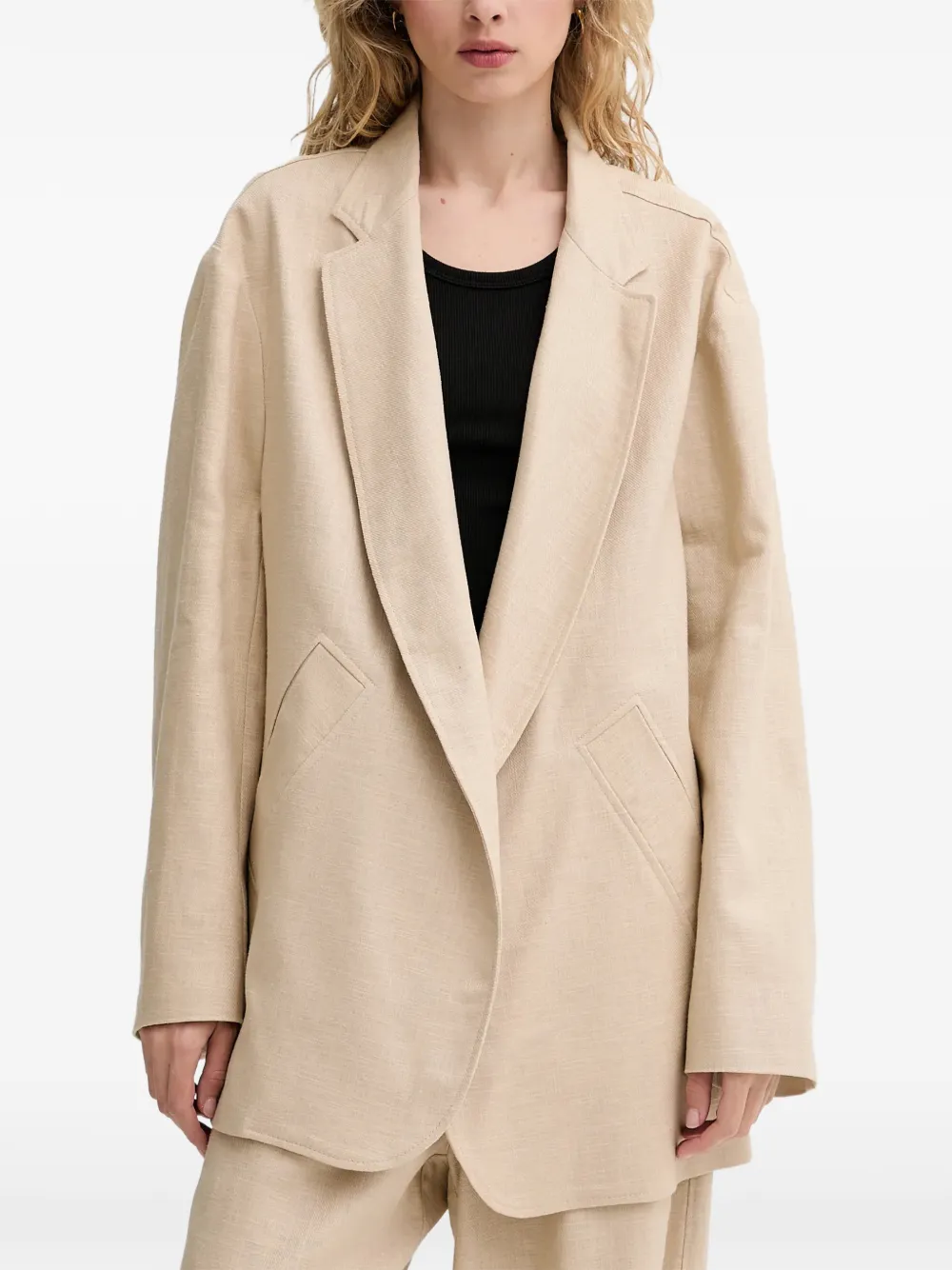 beige open front patch pockets long sleeves tailored design notched lapels