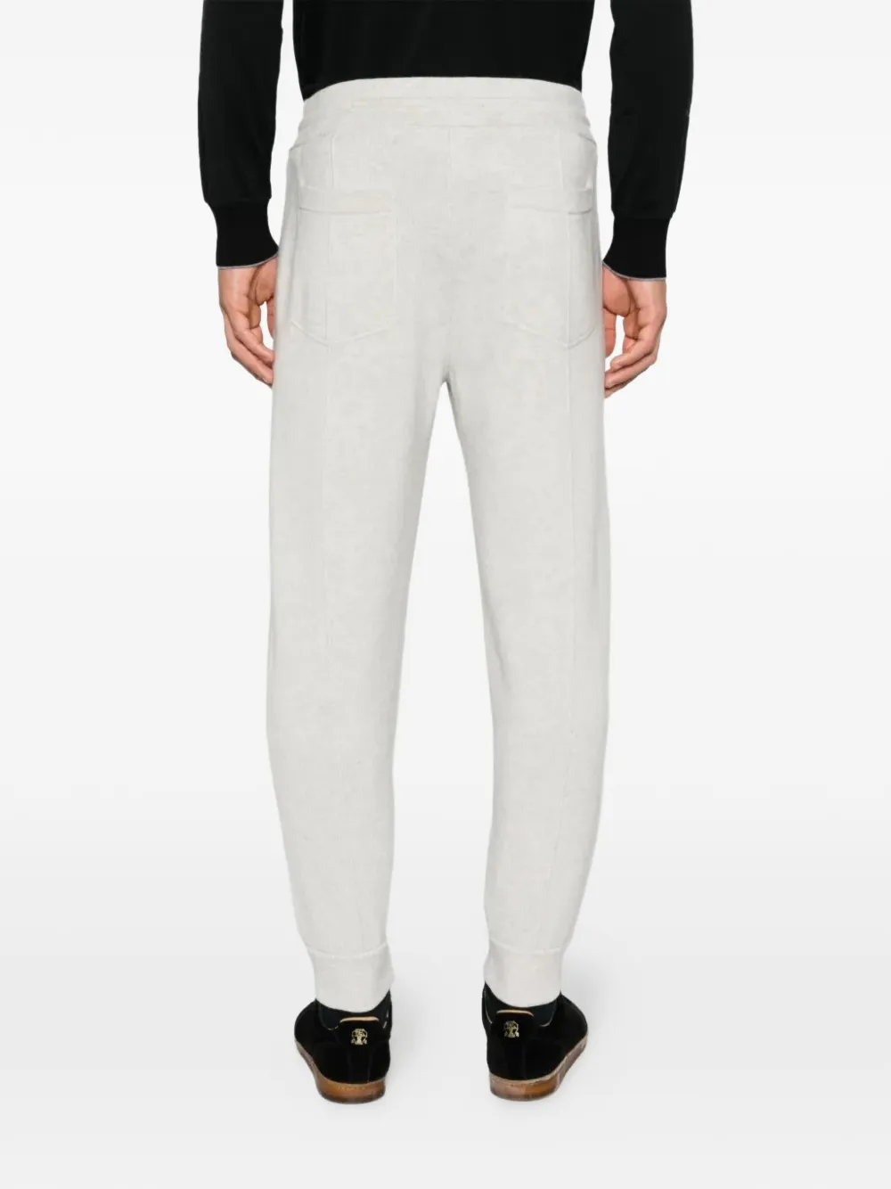 light grey marl pattern drawstring fastening elasticated waistband two rear patch pockets tapered leg ribbed cuffs