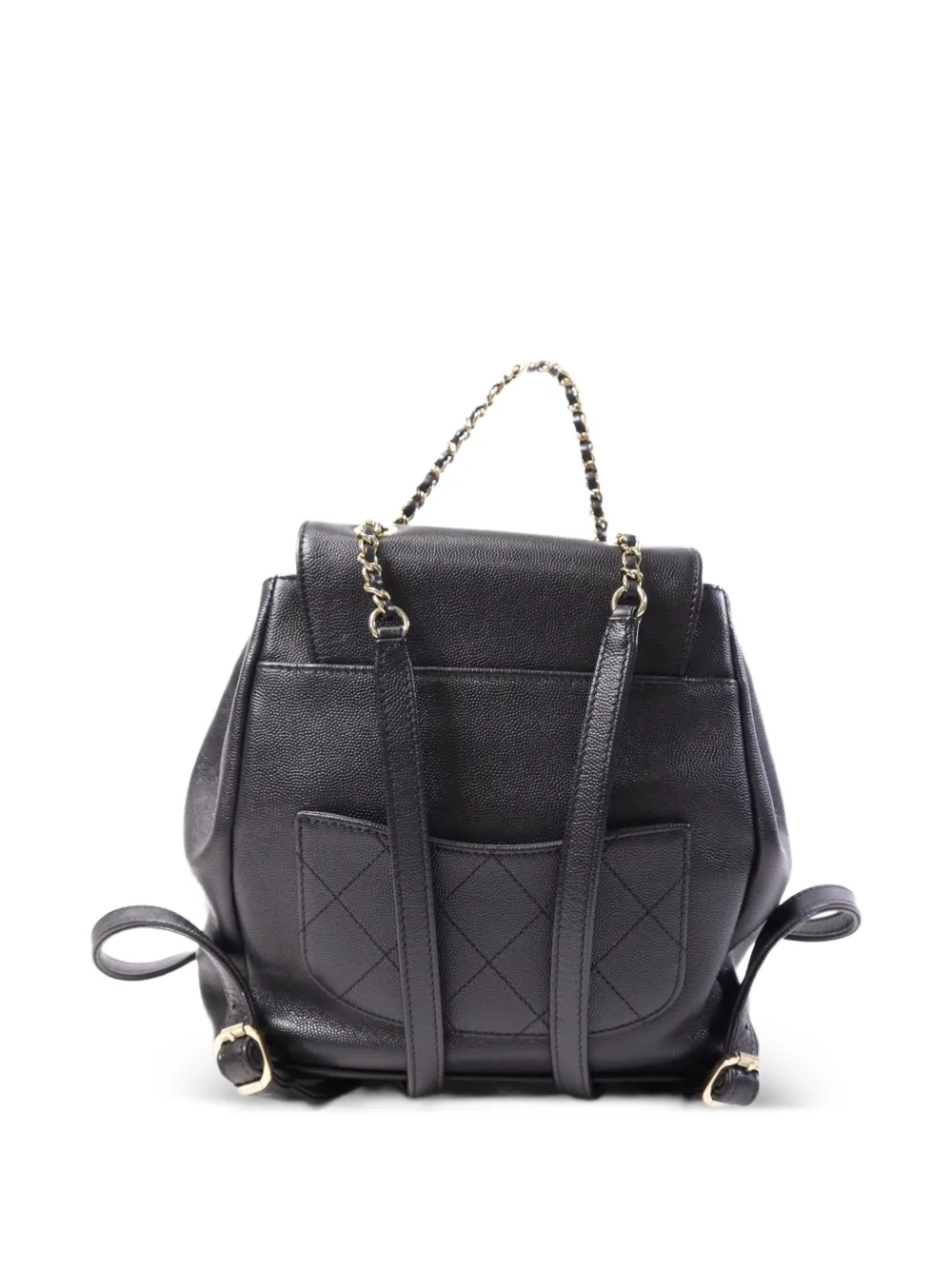 black leather quilted front zip pocket foldover with turn-lock fastening leather-chain link top handle adjustable shoulder straps rear patch pocket Condition: GOOD. This previously owned and used item is in good condition with minimal signs of use. This may include fading of material or plating and scratches.