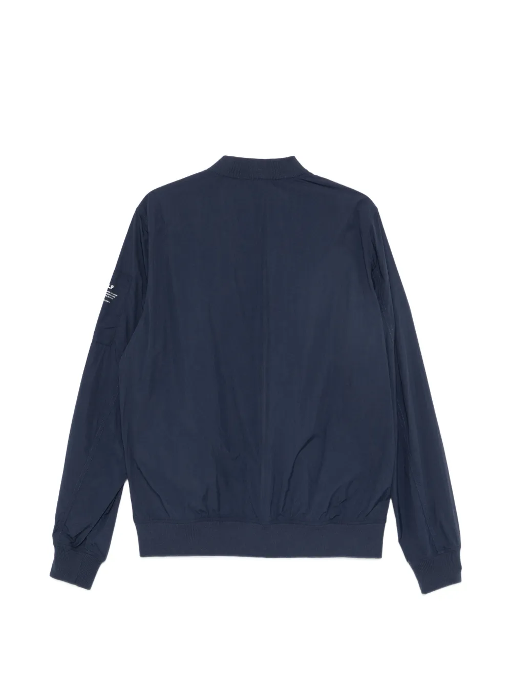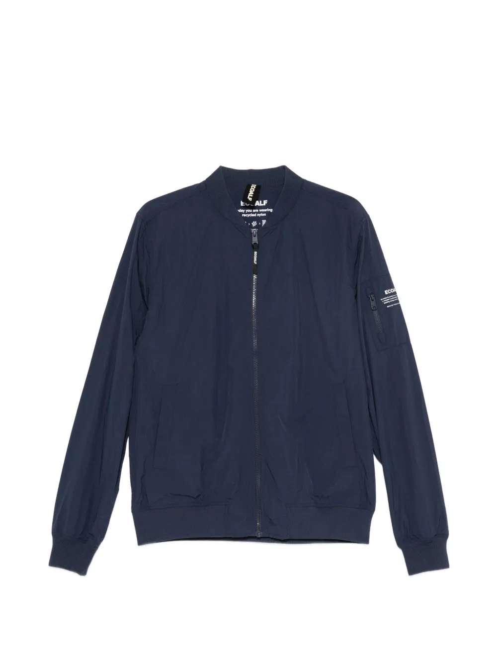 blue front zip fastening band collar long sleeves sleeve zip pocket two side slit pockets ribbed cuffs ribbed hem