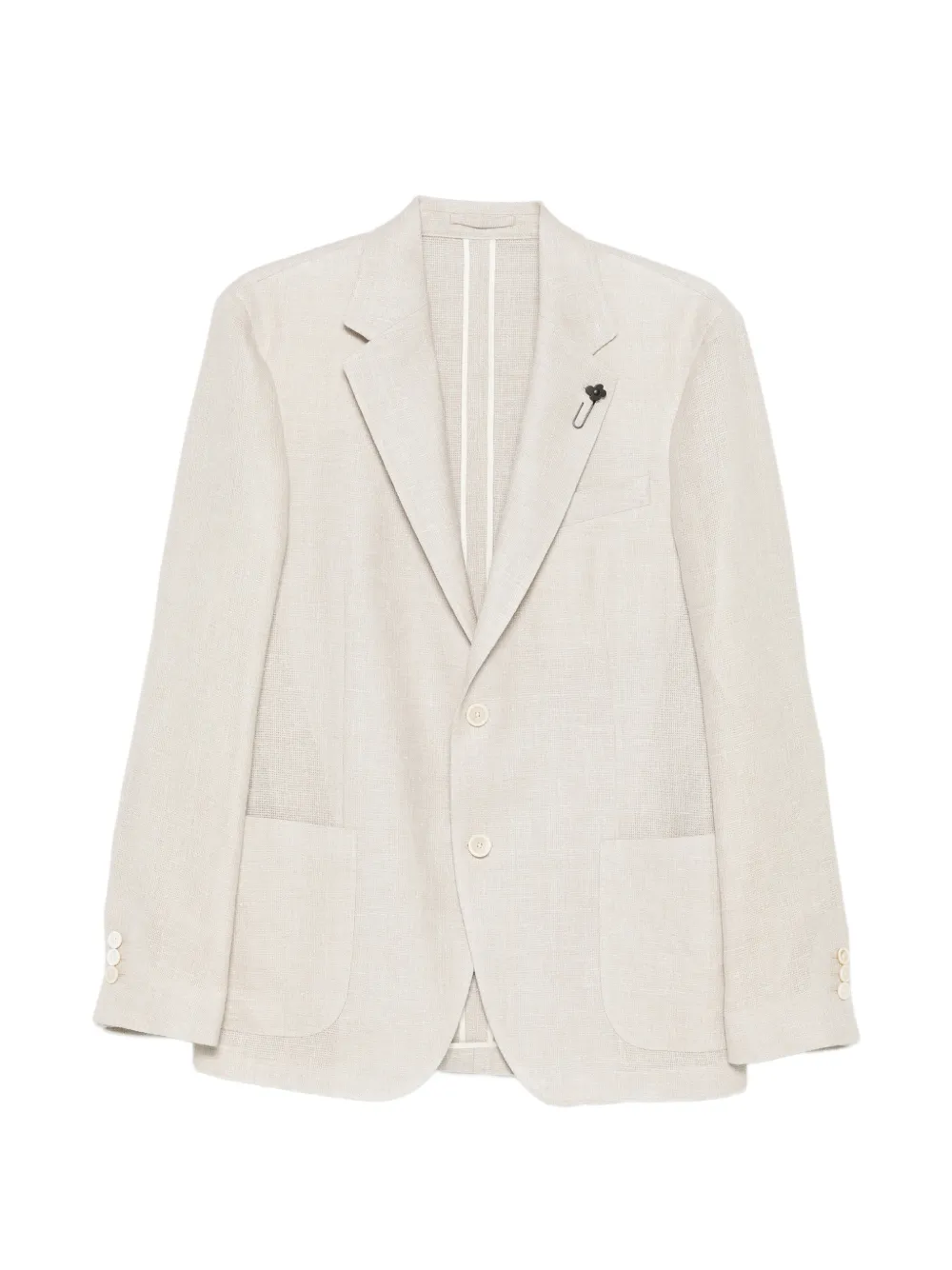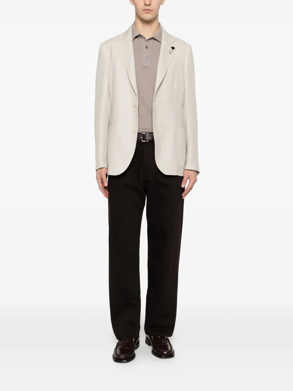 beige flower pin button fastening notched lapels patch pockets three-button cuffs