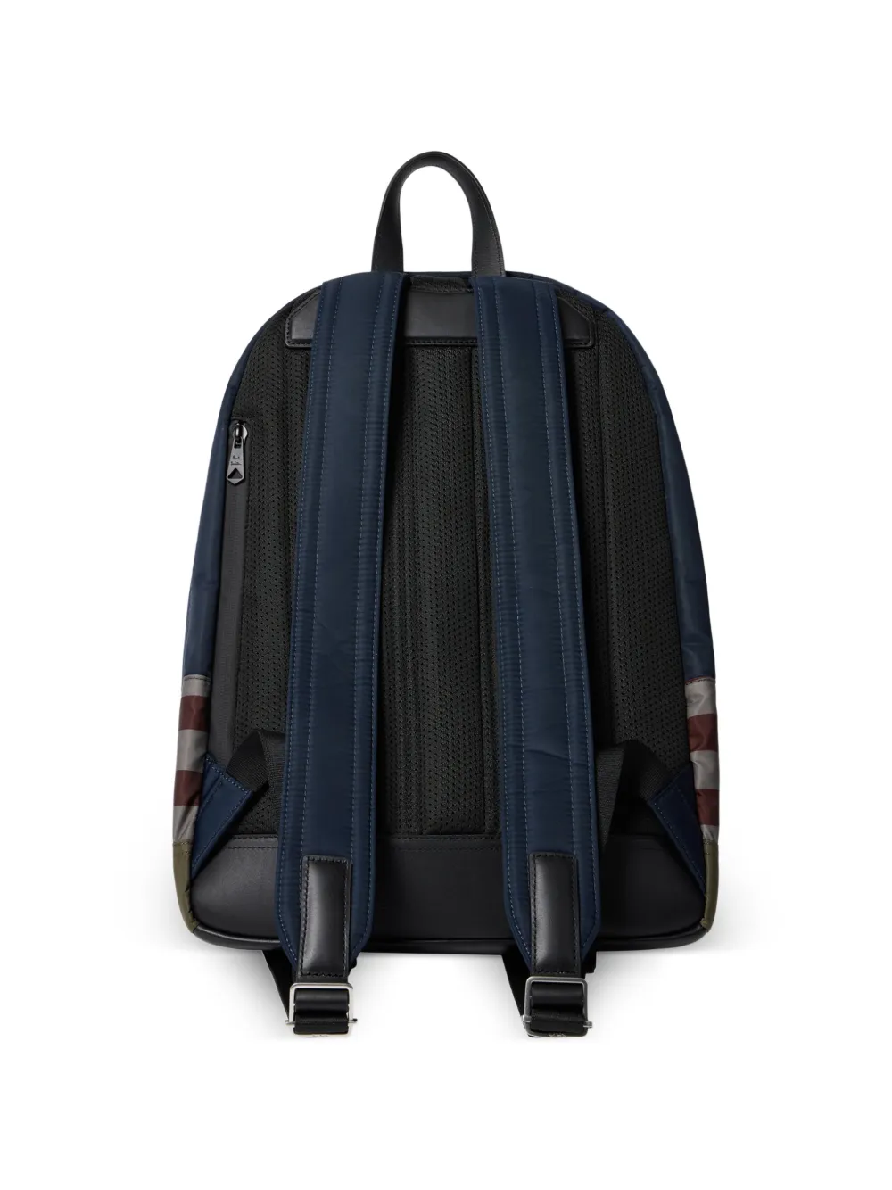 navy blue striped design top handle front pocket zip fastening adjustable straps